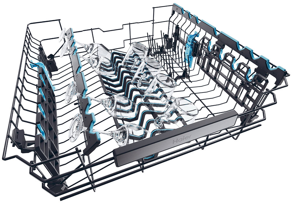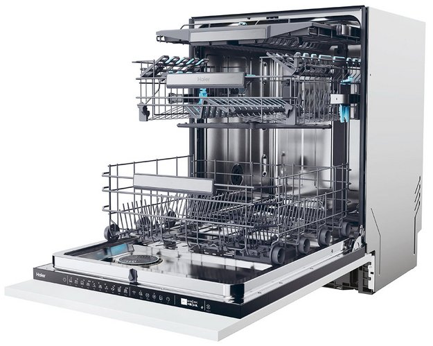 Встраиваемая модель Хайер отлично впишется в любой интерьер, главное — правильно выбрать место, чтобы подвести коммуникации. Устанавливается в нишу целиком, полностью закрывается декоративной панелью. Имеет стандартные размеры, поэтому может не поместиться на очень маленькой кухне. В камеру можно загрузить ограниченное число комплектов: 16 шт. Комплектом считается набор посуды на одного человека, который нужен для полноценного приема пищи: глубокая и плоская тарелки, тарелка для салата, блюдце под чашку, сама чашка, ложка и вилка.