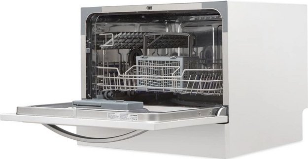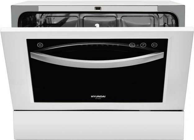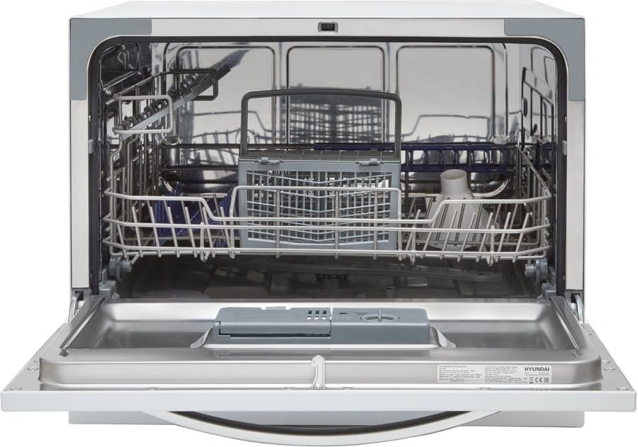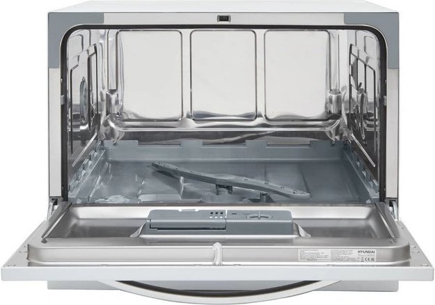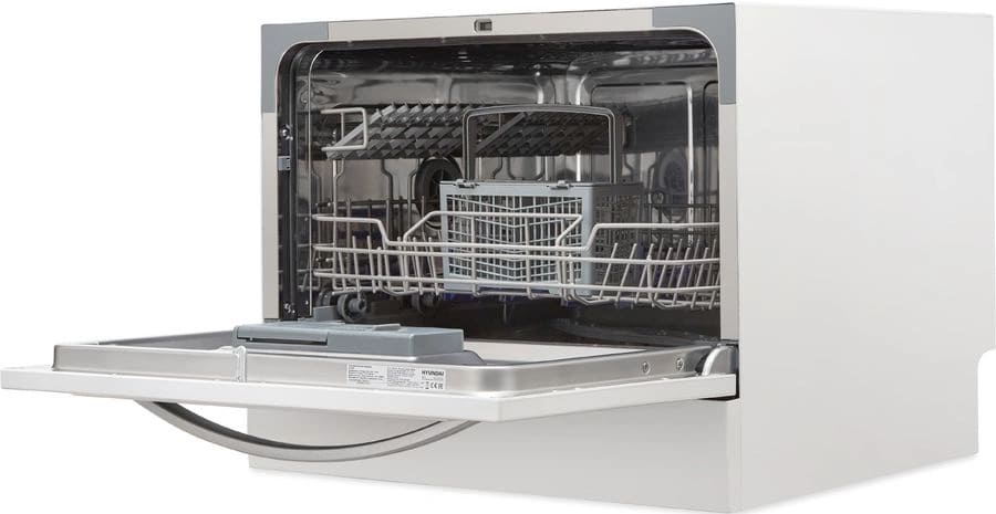 Отдельностоящая модель Хендай отлично впишется в кухонный интерьер, главное — правильно выбрать место, чтобы подвести коммуникации. Компактные размеры позволяют разместить ее даже на очень маленькой кухне. В камеру можно загрузить ограниченное число комплектов: 6 шт. Комплектом считается набор посуды на одного человека, который нужен для полноценного приема пищи: глубокая и плоская тарелки, тарелка для салата, блюдце под чашку, сама чашка, ложка и вилка.