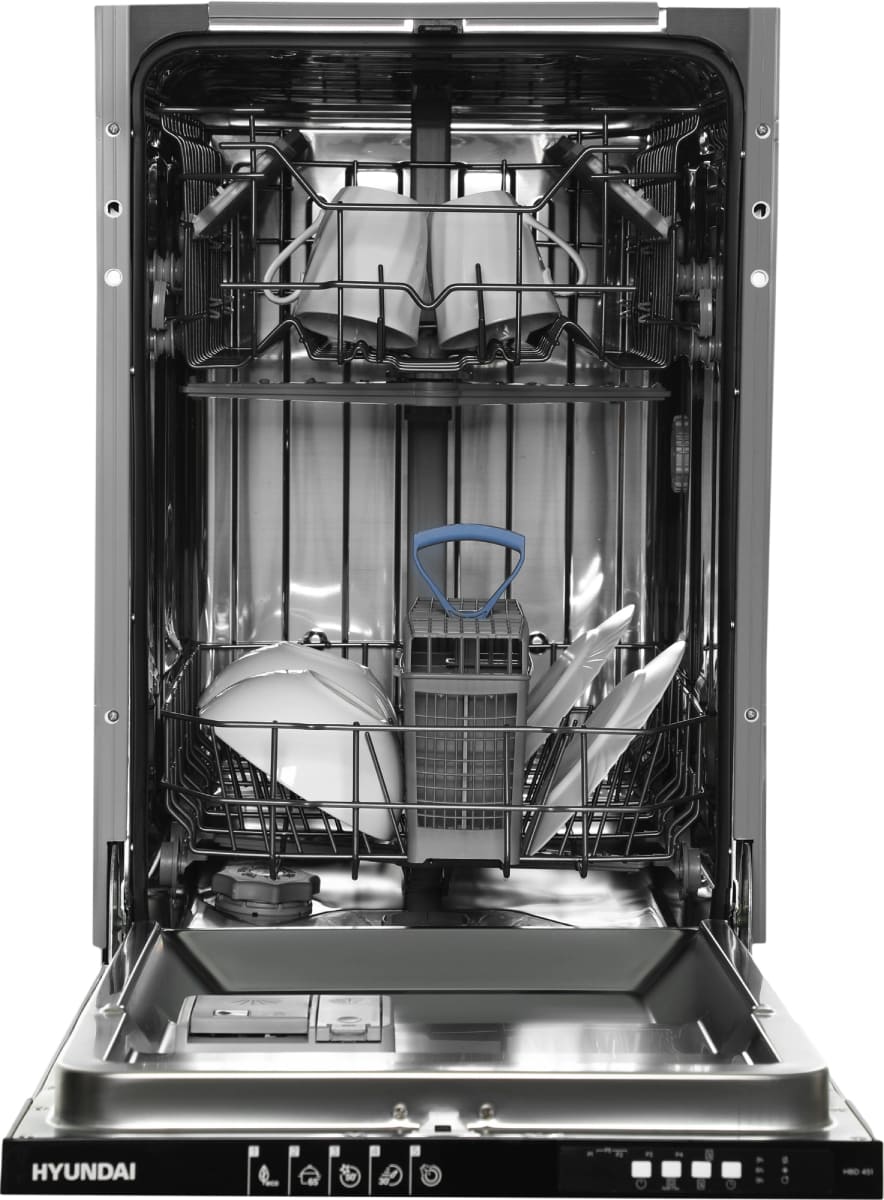 Встраиваемая модель Хендай отлично впишется в любой интерьер, главное — правильно выбрать место, чтобы подвести коммуникации. Устанавливается в нишу целиком, полностью закрывается декоративной панелью. Обратите внимание: в комплекте не идет фасад, его необходимо установить самостоятельно. Имеет уменьшенную ширину — благодаря этому поместится даже на очень маленькой кухне. В камеру можно загрузить ограниченное число комплектов: 10 шт. Комплектом считается набор посуды на одного человека, который нужен для полноценного приема пищи: глубокая и плоская тарелки, тарелка для салата, блюдце под чашку, сама чашка, ложка и вилка.