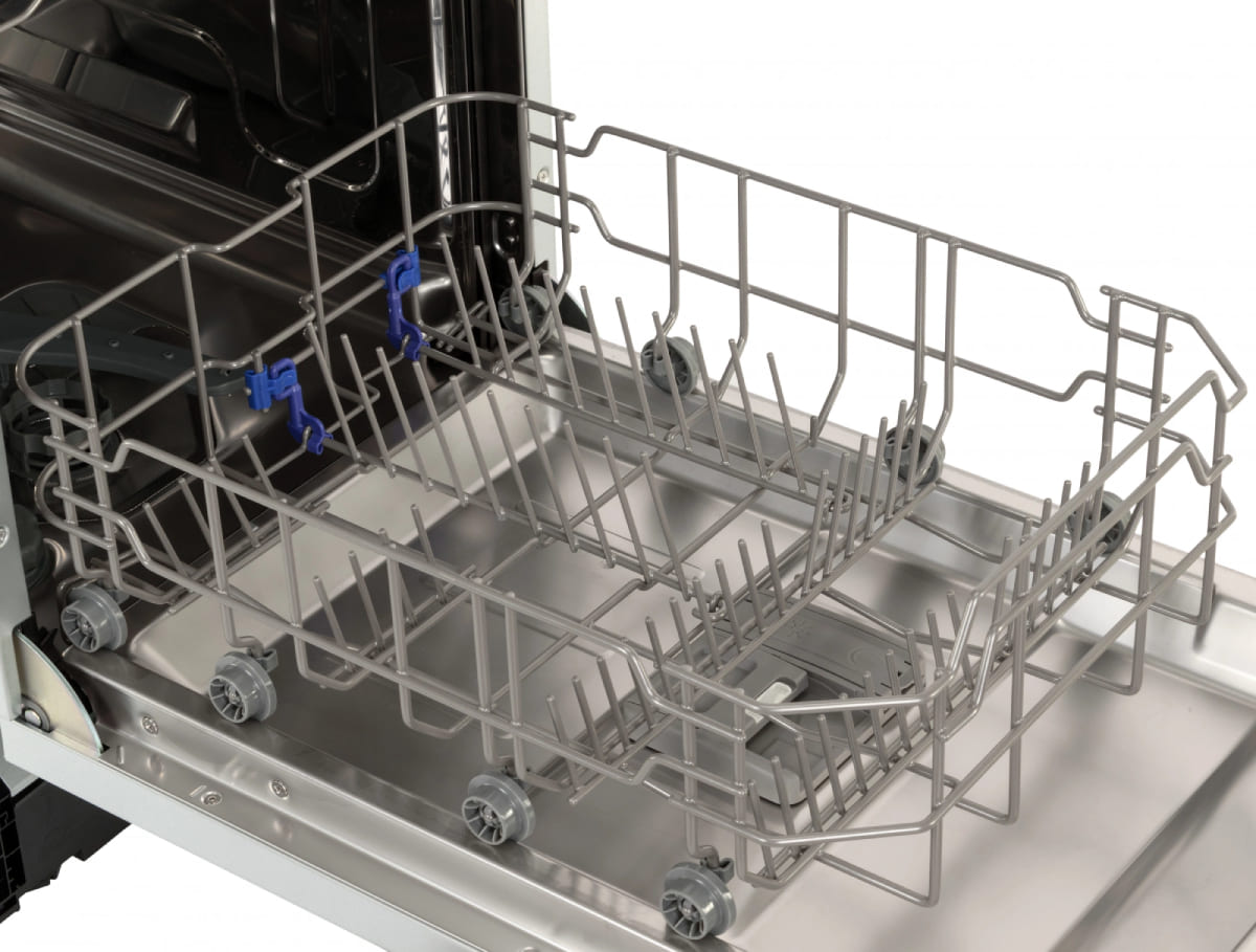 Верхняя корзина может регулироваться по высоте, так что при необходимости в нее можно поместить тарелки большего размера. Нижняя корзина позволяет установить вертикально большие суповые тарелки и блюда большого диаметра — для этого верхнюю корзину можно поднять выше. Тарелки обычно устанавливаются в откидные рамки-держатели, которые легко складываются на дно корзины. Всю посуду в нижней корзине рекомендуется устанавливать без соприкосновения предметов друг с другом, углублением к центру для более интенсивного воздействия струй воды на внутреннюю часть посуды.
