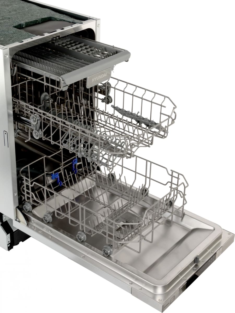 Встраиваемая модель Хендай отлично впишется в любой интерьер, главное — правильно выбрать место, чтобы подвести коммуникации. Устанавливается в нишу целиком, полностью закрывается декоративной панелью. Обратите внимание: в комплекте не идет фасад, его необходимо установить самостоятельно. Имеет уменьшенную ширину — благодаря этому поместится даже на очень маленькой кухне. В камеру можно загрузить ограниченное число комплектов: 10 шт. Комплектом считается набор посуды на одного человека, который нужен для полноценного приема пищи: глубокая и плоская тарелки, тарелка для салата, блюдце под чашку, сама чашка, ложка и вилка.