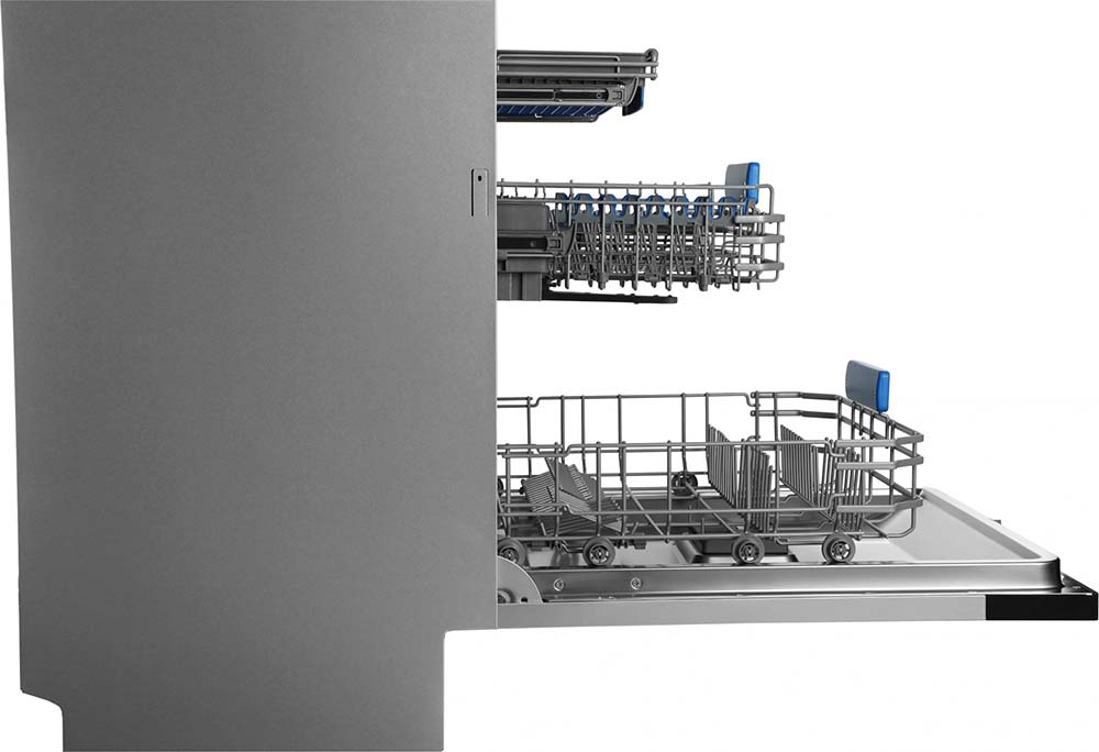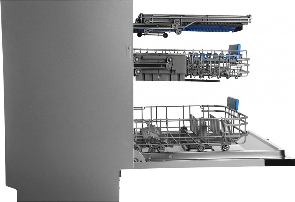 Полноразмерные модели выбирают в больших семьях, а также те, кто много готовит или часто принимает гостей. Их вместимость может составить до 15 комплектов посуды, а габаритные размеры соответствуют размерам стандартной кухонной мебели шириной и глубиной 60 см и высотой 82-85 см. Они выпускаются как во встраиваемом, так и в отдельностоящем варианте: во втором случае для установки понадобится достаточно много места. Как правило, полноразмерные приборы отличаются большим набором стандартных и специальных программ мойки, а также дополнительных опций: в частности, они оснащаются третьей корзиной для мытья столовых приборов.