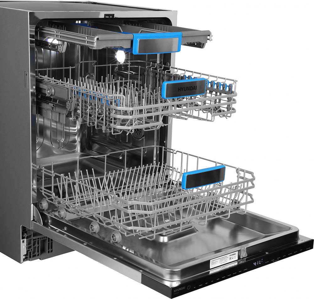 Встраиваемая модель Хендай отлично впишется в любой интерьер, главное — правильно выбрать место, чтобы подвести коммуникации. Устанавливается в нишу целиком, полностью закрывается декоративной панелью. Обратите внимание: в комплекте не идет фасад, его необходимо установить самостоятельно. Имеет стандартные размеры, поэтому может не поместиться на очень маленькой кухне. В камеру можно загрузить ограниченное число комплектов: 16 шт. Комплектом считается набор посуды на одного человека, который нужен для полноценного приема пищи: глубокая и плоская тарелки, тарелка для салата, блюдце под чашку, сама чашка, ложка и вилка.