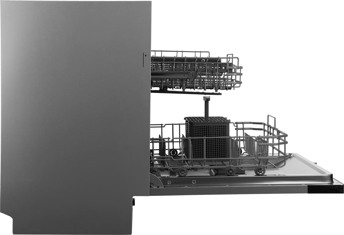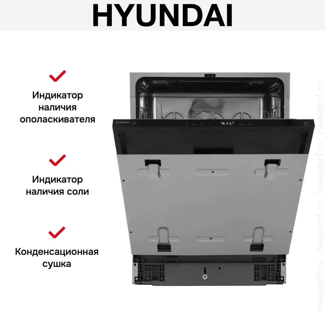 Встраиваемая модель Хендай отлично впишется в любой интерьер, главное — правильно выбрать место, чтобы подвести коммуникации. Устанавливается в нишу целиком, полностью закрывается декоративной панелью. Обратите внимание: в комплекте не идет фасад, его необходимо установить самостоятельно. Имеет стандартные размеры, поэтому может не поместиться на очень маленькой кухне. В камеру можно загрузить ограниченное число комплектов: 13 шт. Комплектом считается набор посуды на одного человека, который нужен для полноценного приема пищи: глубокая и плоская тарелки, тарелка для салата, блюдце под чашку, сама чашка, ложка и вилка.