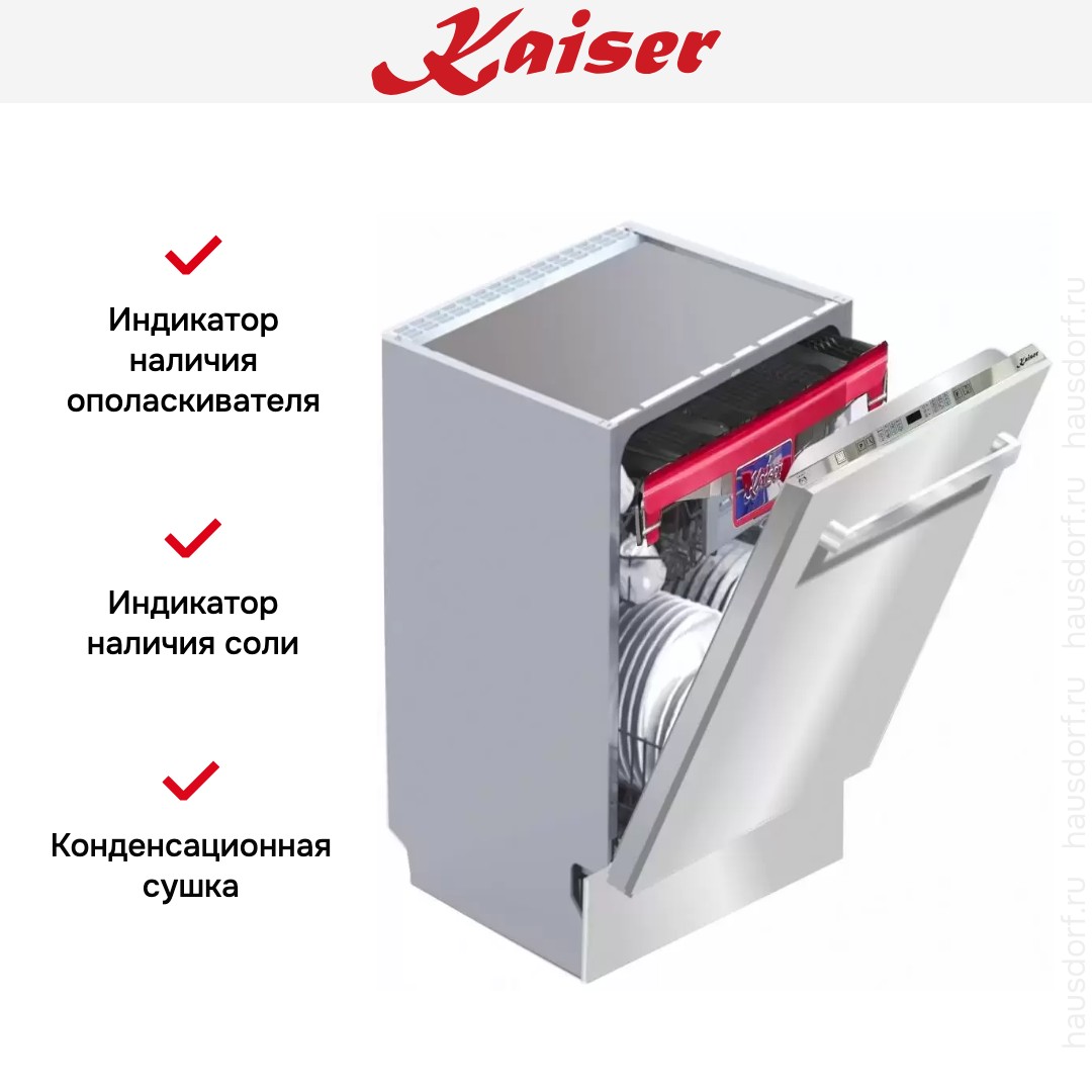 Встраиваемая модель Кайзер отлично впишется в любой интерьер, главное — правильно выбрать место, чтобы подвести коммуникации. Устанавливается в нишу целиком, полностью закрывается декоративной панелью. Обратите внимание: в комплекте не идет фасад, его необходимо установить самостоятельно. Имеет стандартные размеры, поэтому может не поместиться на очень маленькой кухне. В камеру можно загрузить ограниченное число комплектов: 14 шт. Комплектом считается набор посуды на одного человека, который нужен для полноценного приема пищи: глубокая и плоская тарелки, тарелка для салата, блюдце под чашку, сама чашка, ложка и вилка.