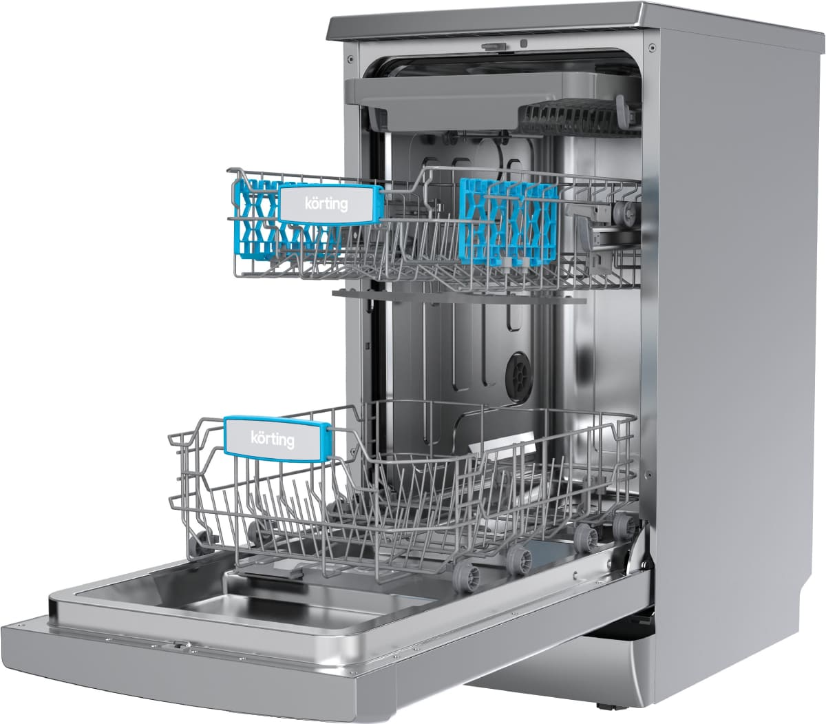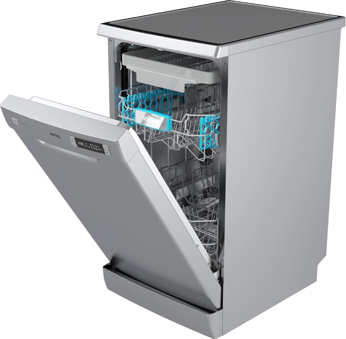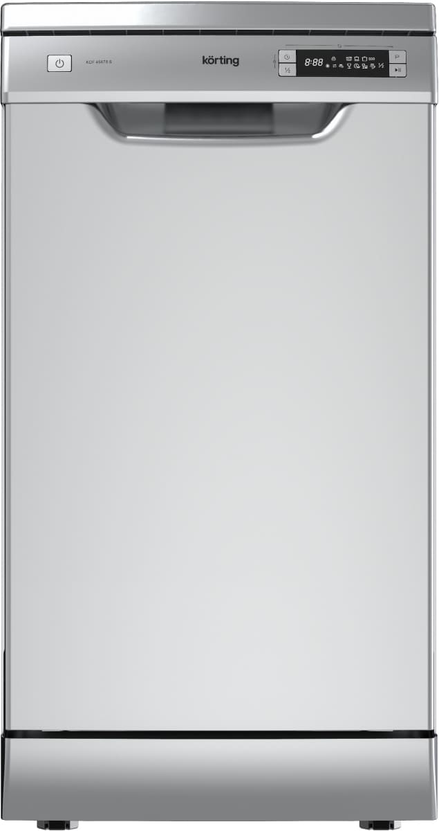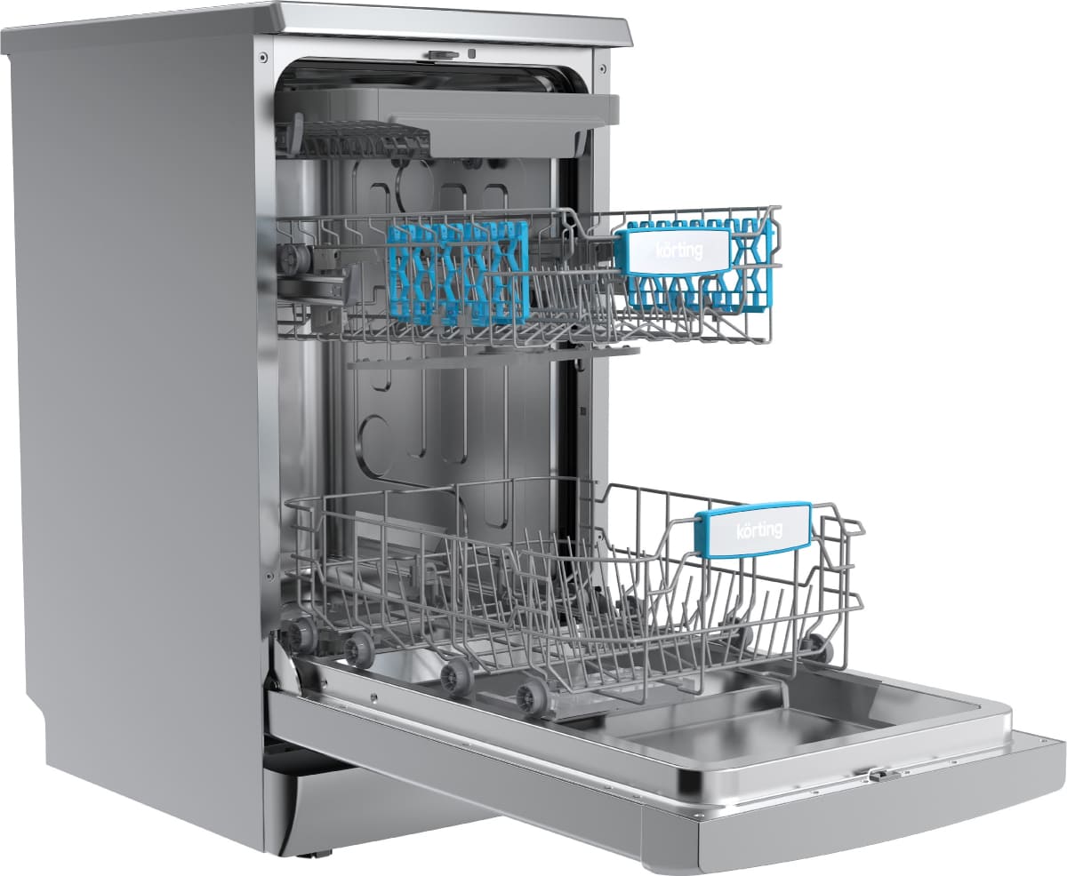 Отдельностоящая модель Кертинг отлично впишется в кухонный интерьер, главное — правильно выбрать место, чтобы подвести коммуникации. Имеет уменьшенную ширину — благодаря этому поместится даже на очень маленькой кухне. В камеру можно загрузить ограниченное число комплектов: 10 шт. Комплектом считается набор посуды на одного человека, который нужен для полноценного приема пищи: глубокая и плоская тарелки, тарелка для салата, блюдце под чашку, сама чашка, ложка и вилка.
