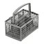 Корзина для столовых приборов достаточно высока, ввиду чего она устанавливается в нижнем коробе, где для нее предусматривается специальное место между разделителями для тарелок. Приборы в корзине могут размещаться как вниз, так и вверх рукоятками — это зависит от количества приборов и требований пользователя. Однако острые предметы — ножи или вилки — необходимо размещать острием вниз для предотвращения травм. Ножи рекомендуется размещать в корзинах с осторожностью, поскольку лезвия из керамики, например, могут затупиться. Чтобы избежать этого, следует использовать фирменные моющие средства и обязательно располагать ножи по отдельности, чтобы они не соприкасались с другими предметами.