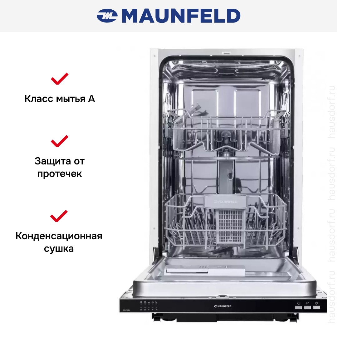 В базовую комплектацию посудомоечной машины входят сливной и заливной шланг, воронка для соли и держатель для шланга. Отдельно можно приобрести дополнительные аксессуары — подставку для столовых приборов, держатель для стаканов и т.д. Машинка MAUNFELD MLP08I является довольно узкой по сравнению с аналогами, ее ширина составляет всего лишь 44,8 см, что позволяет расположить ее в сравнительно небольшой нише.