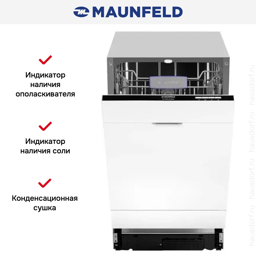 Посудомоечная машина Maunfeld MLP 082D Light Beam — полностью встраиваемая узкая модель, созданная для компактных кухонь и аккуратной интеграции под фасад гарнитура. Ее габариты 81.5—86.5×44.8×55 см и ниша для монтажа 82×45×57.5 см позволяют установить устройство даже в плотных планировках. Узкая ширина 44.8 см экономит место, при этом вместимость девять комплектов посуды делает прибор отличным решением для пары или небольшой семьи. Высота регулируется ножками, что помогает точно выровнять фронтальную панель с соседними ящиками.