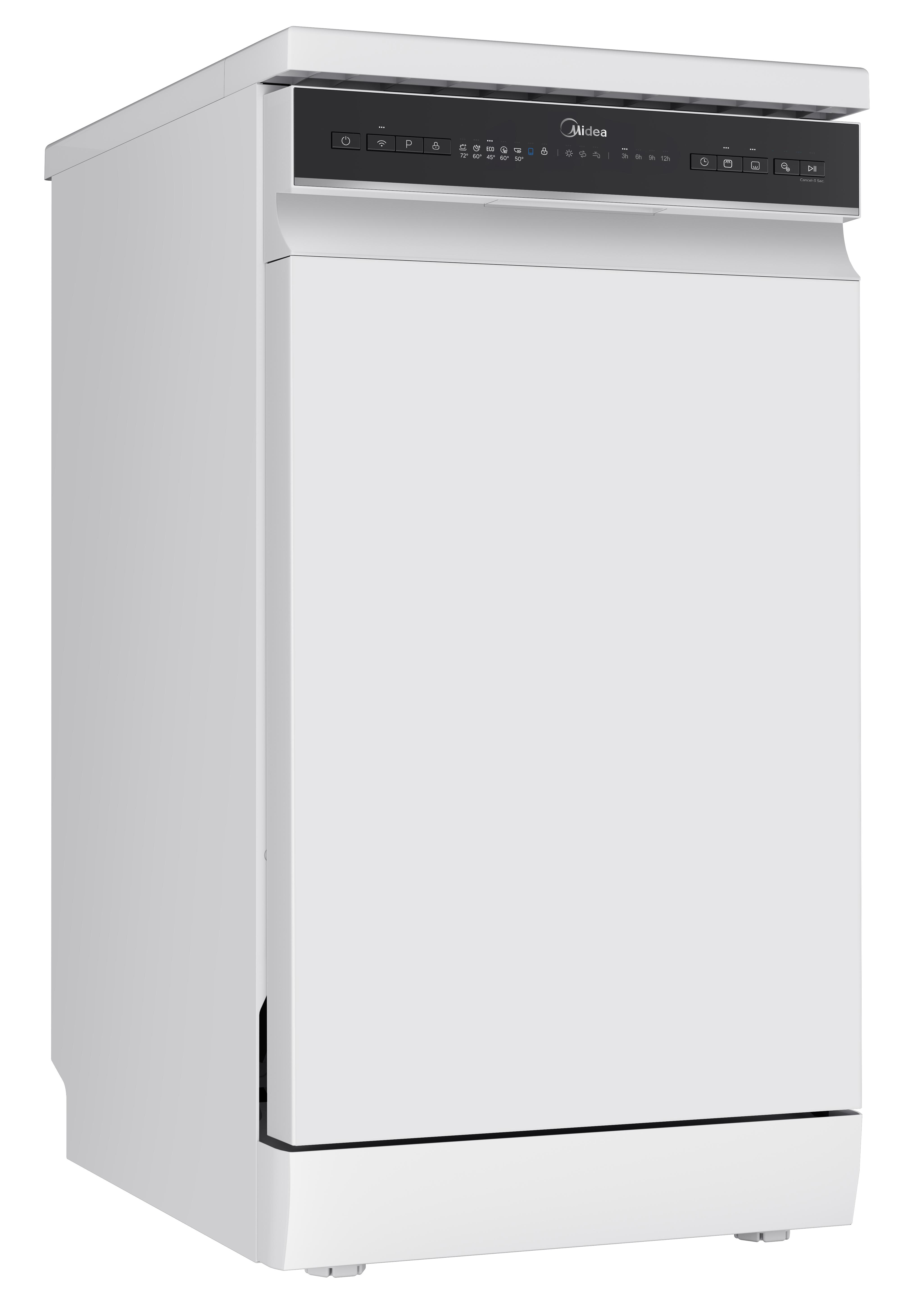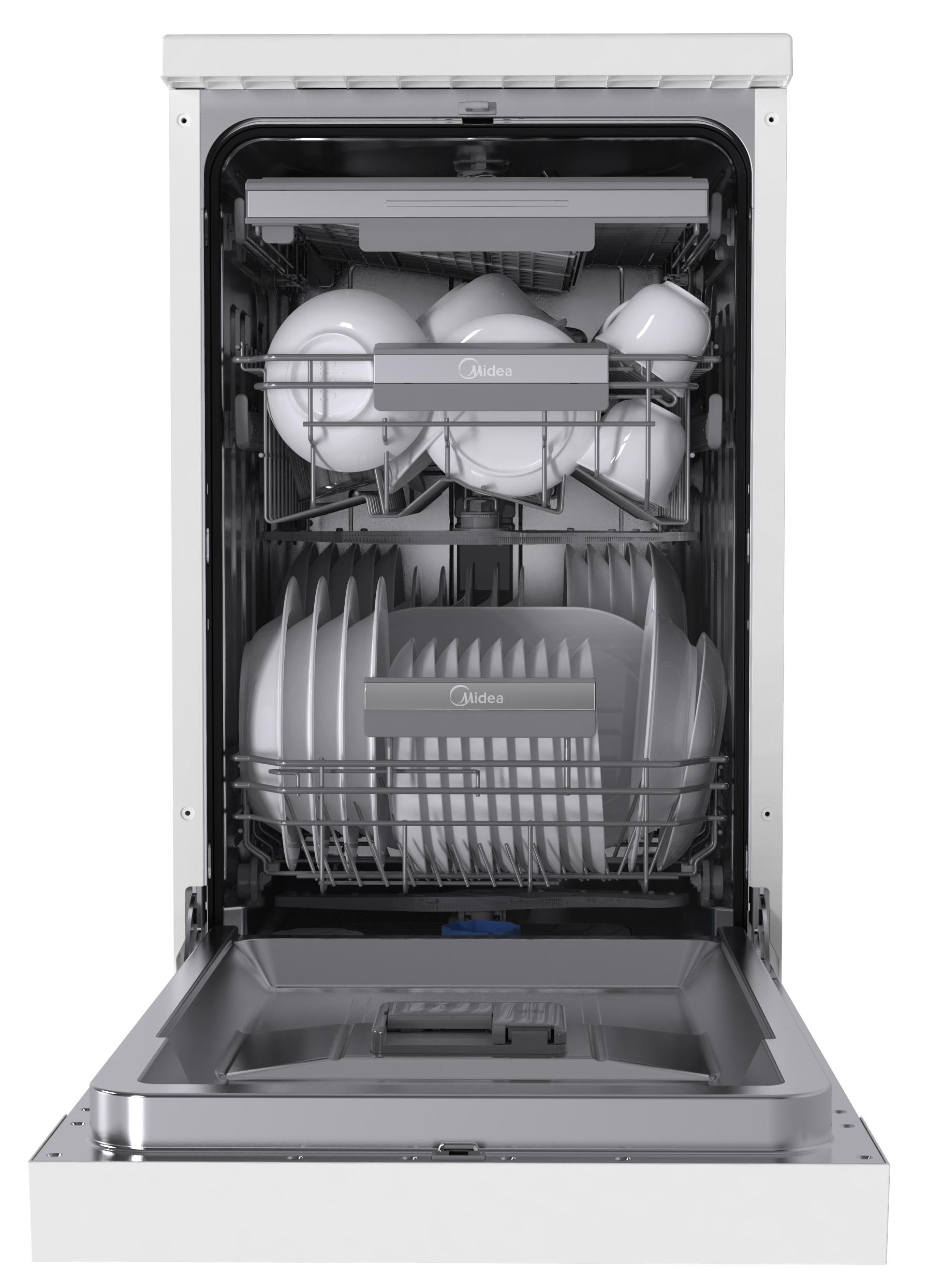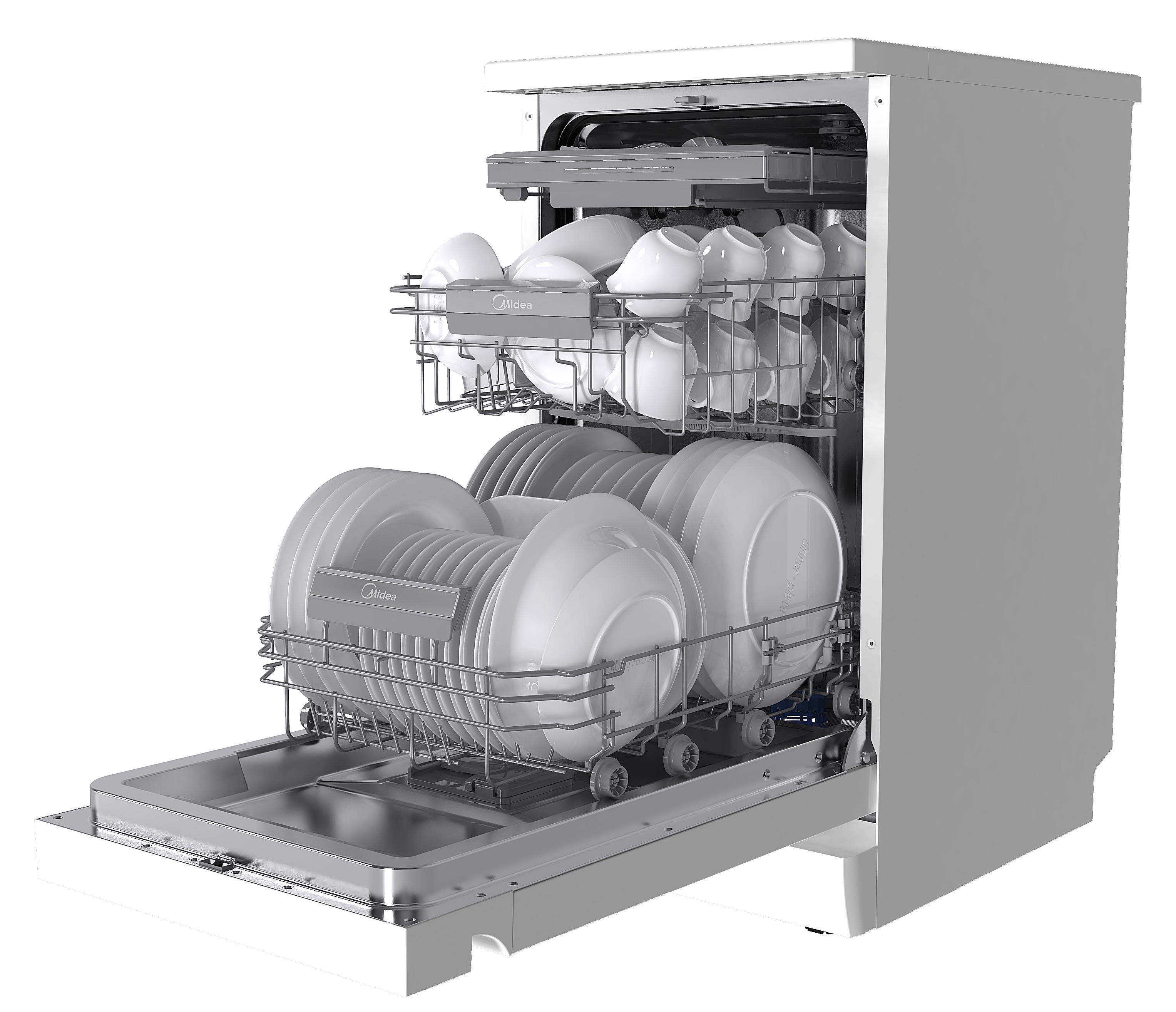 Отдельностоящая модель Мидеа отлично впишется в кухонный интерьер, главное — правильно выбрать место, чтобы подвести коммуникации. Имеет уменьшенную ширину — благодаря этому поместится даже на очень маленькой кухне. В камеру можно загрузить ограниченное число комплектов: 10 шт. Комплектом считается набор посуды на одного человека, который нужен для полноценного приема пищи: глубокая и плоская тарелки, тарелка для салата, блюдце под чашку, сама чашка, ложка и вилка.