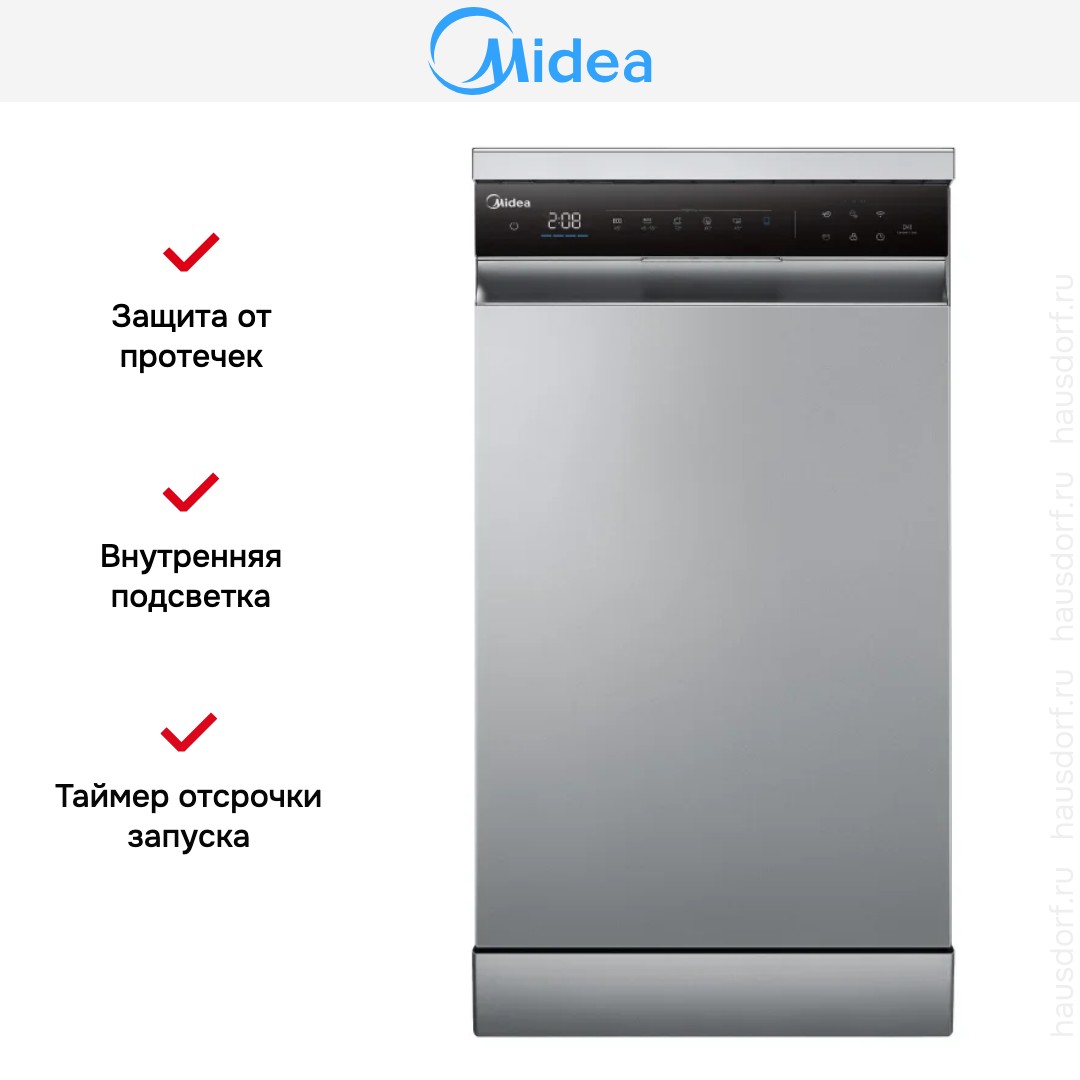 Отдельностоящая посудомоечная машина Midea MFD45S350SI выполнена в сдержанном серебристом цвете с черной открытой панелью управления на фронтальной части. Компактный узкий корпус 84.5×44.8×60 см экономит место на кухне и легко вписывается в нишу за счет стандартной глубины. Элегантное сочетание металлика и черного пластика придает технике аккуратный современный вид. Сенсорные клавиши и информативный дисплей скрыты на поверхности для минималистичного оформления.