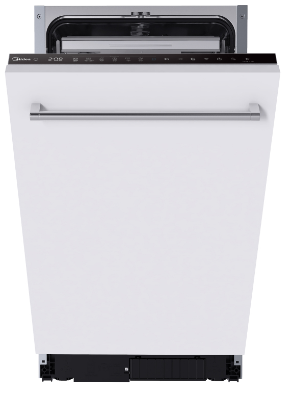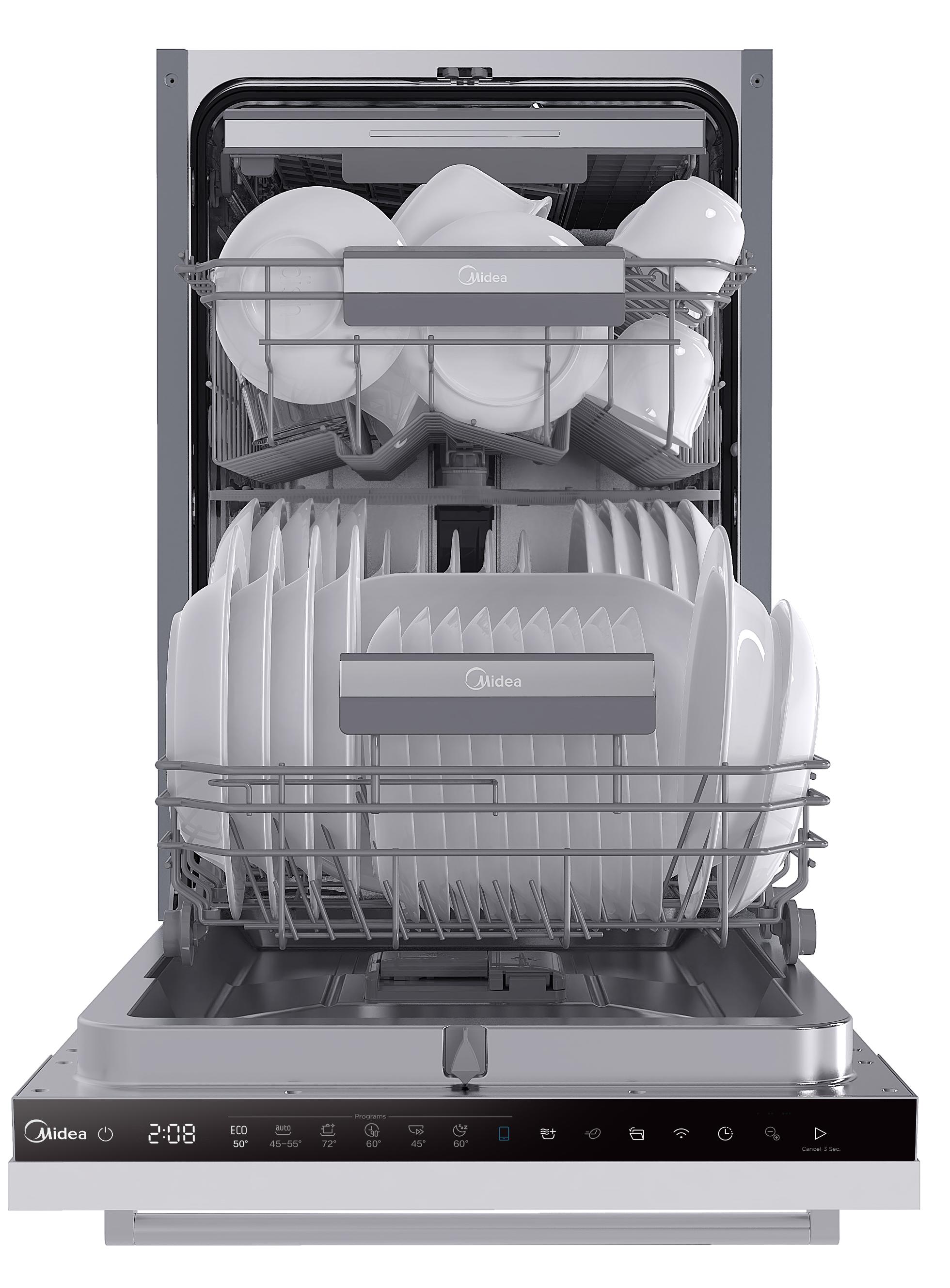 Встраиваемая модель Мидеа отлично впишется в любой интерьер, главное — правильно выбрать место, чтобы подвести коммуникации. Устанавливается в нишу целиком, полностью закрывается декоративной панелью. Обратите внимание: в комплекте не идет фасад, его необходимо установить самостоятельно. Имеет уменьшенную ширину — благодаря этому поместится даже на очень маленькой кухне. В камеру можно загрузить ограниченное число комплектов: 10 шт. Комплектом считается набор посуды на одного человека, который нужен для полноценного приема пищи: глубокая и плоская тарелки, тарелка для салата, блюдце под чашку, сама чашка, ложка и вилка.
