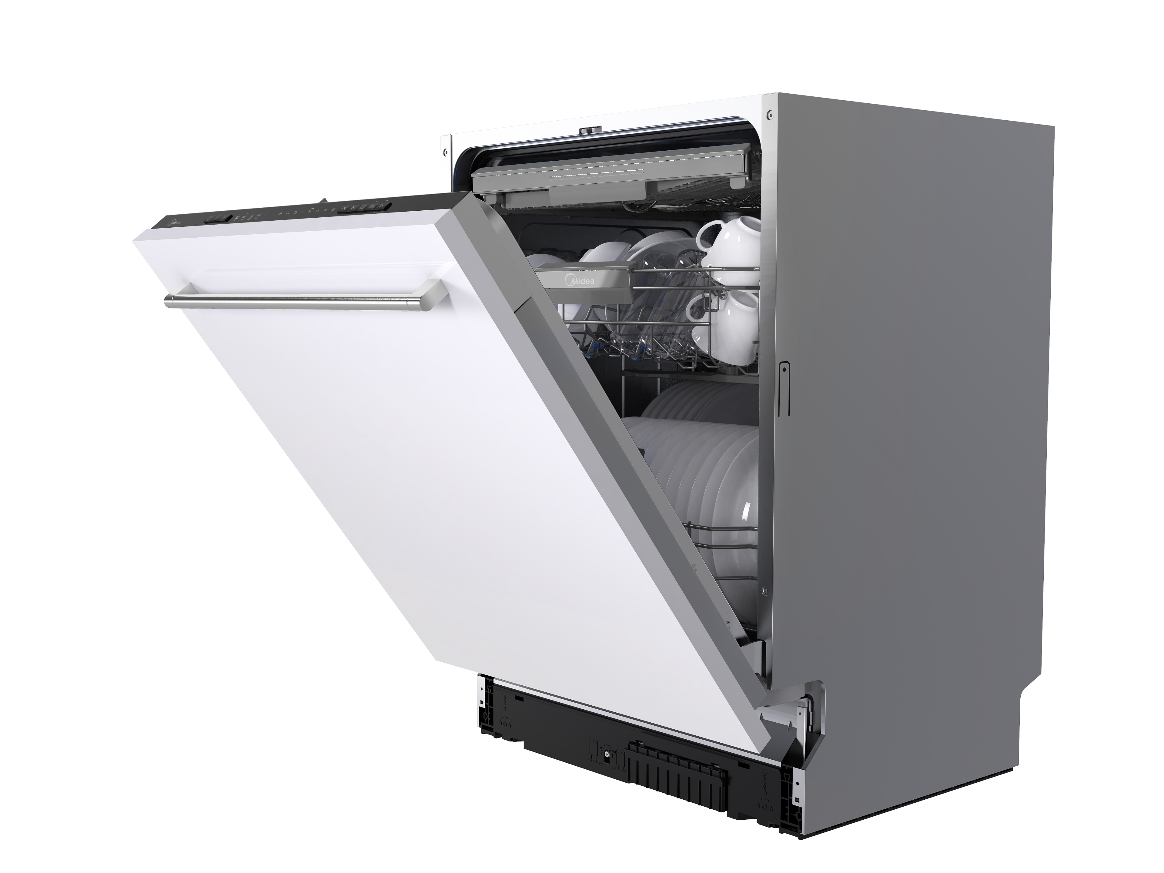 Встраиваемая модель Мидеа отлично впишется в любой интерьер, главное — правильно выбрать место, чтобы подвести коммуникации. Устанавливается в нишу целиком, полностью закрывается декоративной панелью. Обратите внимание: в комплекте не идет фасад, его необходимо установить самостоятельно. Имеет стандартные размеры, поэтому может не поместиться на очень маленькой кухне. В камеру можно загрузить ограниченное число комплектов: 14 шт. Комплектом считается набор посуды на одного человека, который нужен для полноценного приема пищи: глубокая и плоская тарелки, тарелка для салата, блюдце под чашку, сама чашка, ложка и вилка.