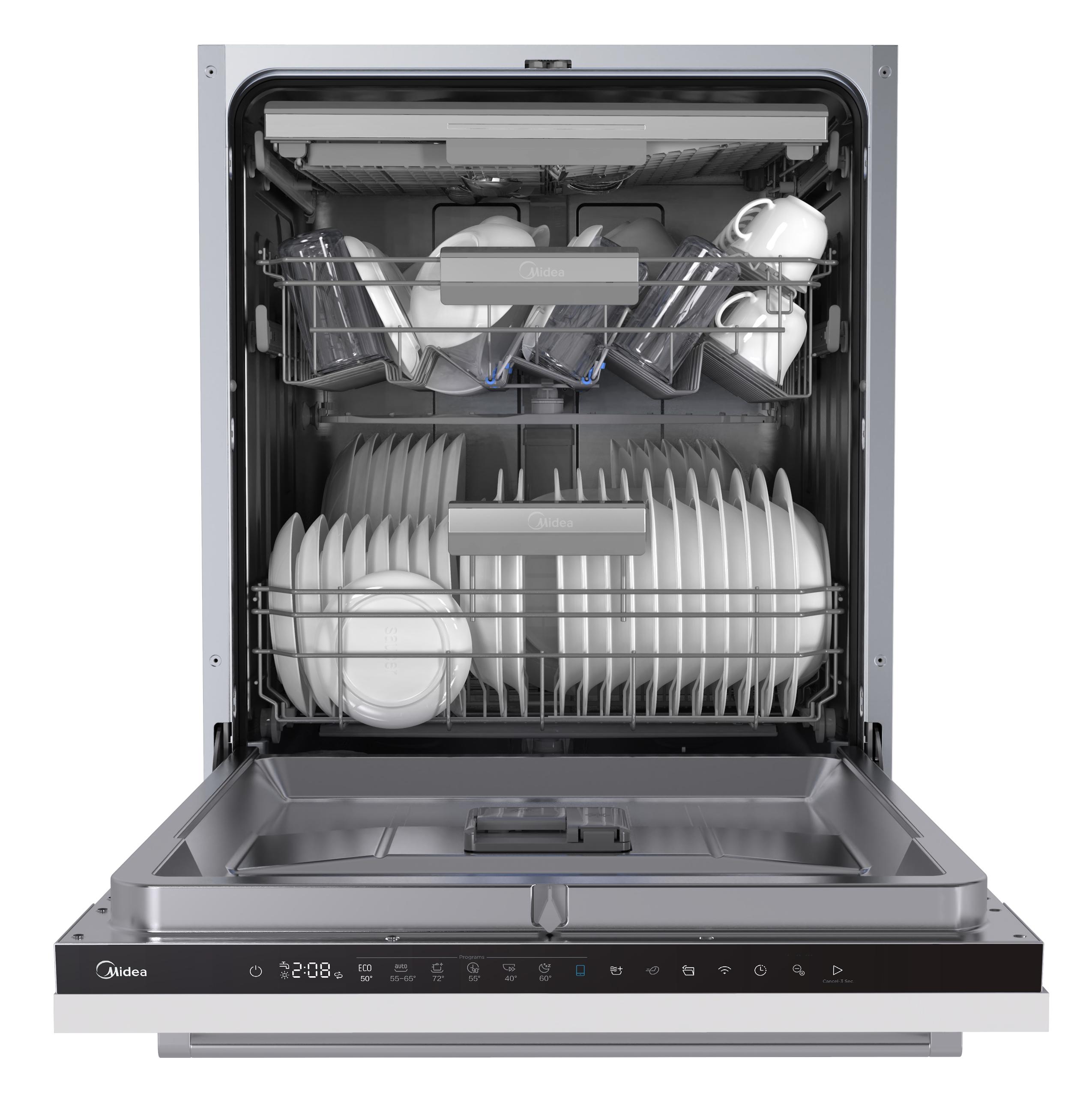 Встраиваемая модель Мидеа отлично впишется в любой интерьер, главное — правильно выбрать место, чтобы подвести коммуникации. Устанавливается в нишу целиком, полностью закрывается декоративной панелью. Обратите внимание: в комплекте не идет фасад, его необходимо установить самостоятельно. Имеет стандартные размеры, поэтому может не поместиться на очень маленькой кухне. В камеру можно загрузить ограниченное число комплектов: 14 шт. Комплектом считается набор посуды на одного человека, который нужен для полноценного приема пищи: глубокая и плоская тарелки, тарелка для салата, блюдце под чашку, сама чашка, ложка и вилка.