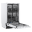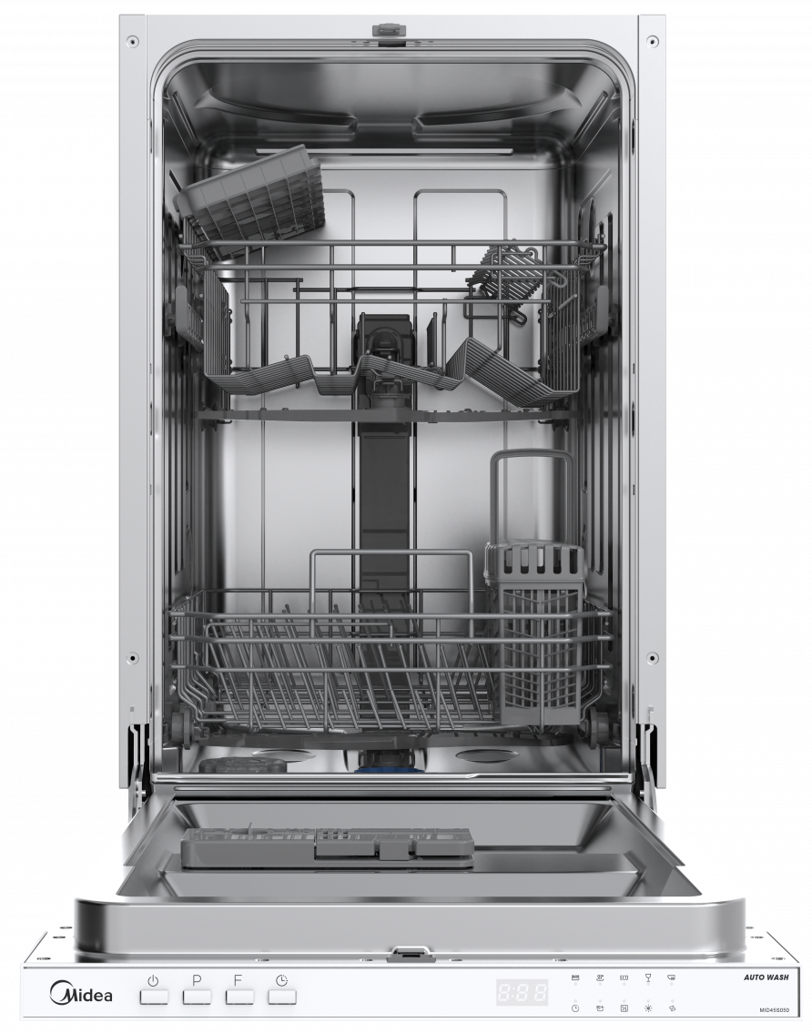 Встраиваемая модель Мидеа отлично впишется в любой интерьер, главное — правильно выбрать место, чтобы подвести коммуникации. Устанавливается в нишу целиком, полностью закрывается декоративной панелью. Обратите внимание: в комплекте не идет фасад, его необходимо установить самостоятельно. Имеет уменьшенную ширину — благодаря этому поместится даже на очень маленькой кухне. В камеру можно загрузить ограниченное число комплектов: 9 шт. Комплектом считается набор посуды на одного человека, который нужен для полноценного приема пищи: глубокая и плоская тарелки, тарелка для салата, блюдце под чашку, сама чашка, ложка и вилка.