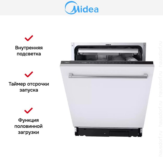 Встраиваемая модель Мидеа отлично впишется в любой интерьер, главное — правильно выбрать место, чтобы подвести коммуникации. Устанавливается в нишу целиком, полностью закрывается декоративной панелью. Обратите внимание: в комплекте не идет фасад, его необходимо установить самостоятельно. Имеет стандартные размеры, поэтому может не поместиться на очень маленькой кухне. В камеру можно загрузить ограниченное число комплектов: 14 шт. Комплектом считается набор посуды на одного человека, который нужен для полноценного приема пищи: глубокая и плоская тарелки, тарелка для салата, блюдце под чашку, сама чашка, ложка и вилка.
