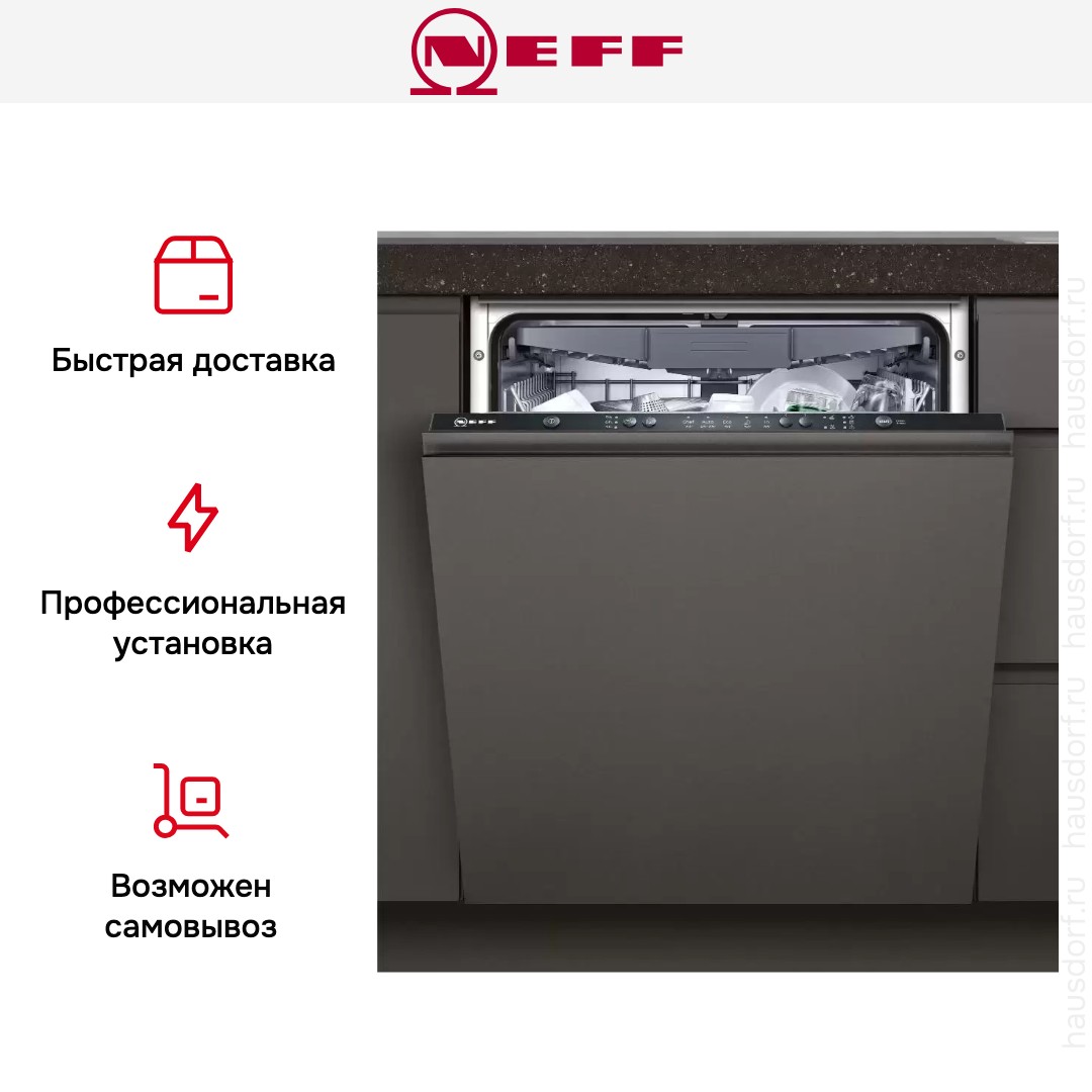 Полностью интегрируемая посудомоечная машина от Neff. В модели установлен теплообменник, который позволяет вымыть чувствительные к перепадам температуры бокалы или хрупкий фарфор — при использовании теплообменника отсутствует температурный шок. Пять стандартных программ включают интенсивную, быструю, ночную мойку и режим с половинной загрузкой. Третий уровень загрузки VarioDrawer и короб с системой Rackmatic-3 позволяют оптимально разместить 13 комплектов посуды. Индикатор «Луч на полу» оповещает об окончании цикла. Для экономии ресурсов служит система попеременной подачи воды в верхнее и нижнее коромысло. Модель оснащена надежной защитой от протечек AquaStop.