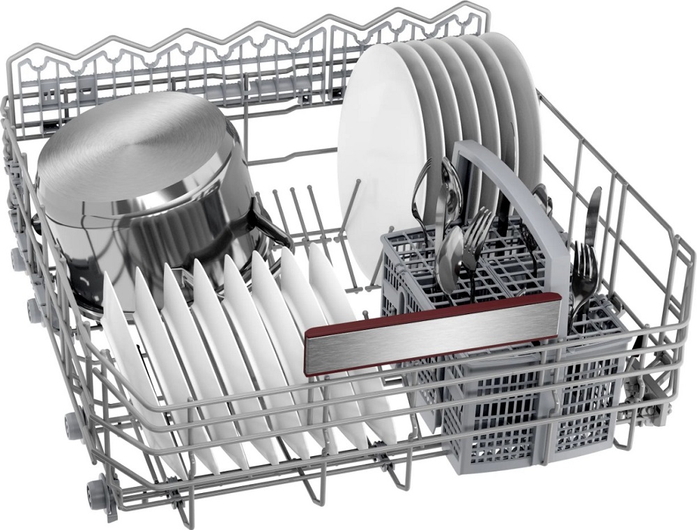 В другом варианте столовые приборы помещаются в съемную корзину, а для ножей предусматривается отдельная полочка. Большое количество ярко окрашенных складных элементов, стоек, держателей и полок позволяет разместить всю посуду компактно и в то же время обеспечить лучшее качество мойки. Система защиты стекла позволяет установить тонкие стаканы, фужеры и бокалы, защищая их от повреждений.