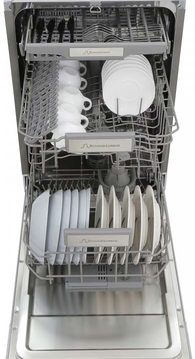 Полноразмерные модели выбирают в больших семьях, а также те, кто много готовит или часто принимает гостей. Их вместимость может составить до 15 комплектов посуды, а габаритные размеры соответствуют размерам стандартной кухонной мебели шириной и глубиной 60 см и высотой 82-85 см. Они выпускаются как во встраиваемом, так и в отдельностоящем варианте: во втором случае для установки понадобится достаточно много места. Как правило, полноразмерные приборы отличаются большим набором стандартных и специальных программ мойки, а также дополнительных опций: в частности, они оснащаются третьей корзиной для мытья столовых приборов.