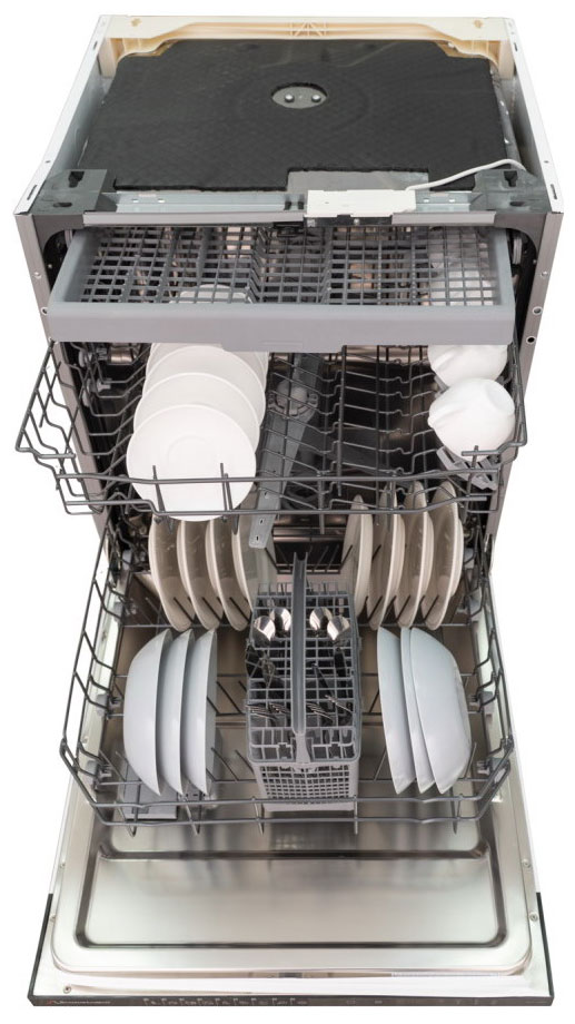 Как правило, полки для столовых приборов находятся в верхней корзине — таким образом, чтобы под ними можно было расположить, например, небольшие чашки. Часто полки оснащаются специальными разделителями, которые позволяют зафиксировать любой предмет, чтобы он не мог случайно сдвинуться с перекрыть доступ к соседним. В ряде моделей для столовых приборов предусматриваются большие полки, которые размещаются на третьем уровне. Такая конструкция считается оптимальной, так как освобождается место в корзинах для более крупных предметов. Такие полки достигают в высоту 5 см, так что на них можно размещать не только обычные ножи, ложки или вилки, но и более объемные половники, шумовки, лопатки, терки и другую подобную утварь.