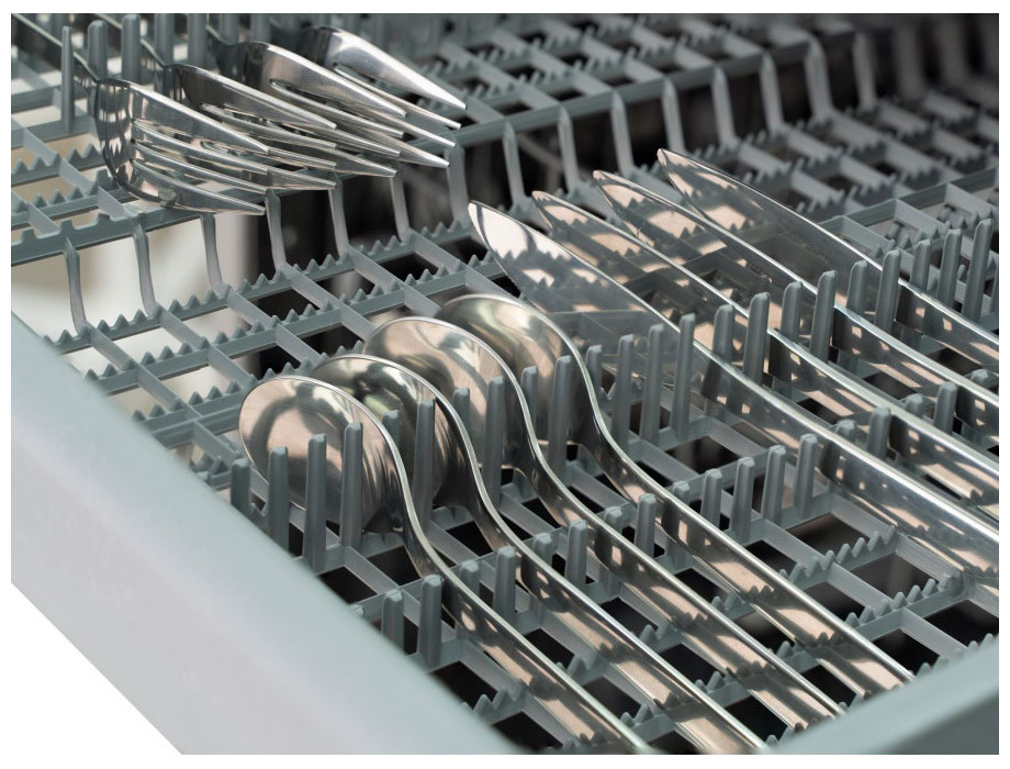 Корзина для столовых приборов достаточно высока, ввиду чего она устанавливается в нижнем коробе, где для нее предусматривается специальное место между разделителями для тарелок. Приборы в корзине могут размещаться как вниз, так и вверх рукоятками — это зависит от количества приборов и требований пользователя. Однако острые предметы — ножи или вилки — необходимо размещать острием вниз для предотвращения травм. Ножи рекомендуется размещать в корзинах с осторожностью, поскольку лезвия из керамики, например, могут затупиться. Чтобы избежать этого, следует использовать фирменные моющие средства и обязательно располагать ножи по отдельности, чтобы они не соприкасались с другими предметами.