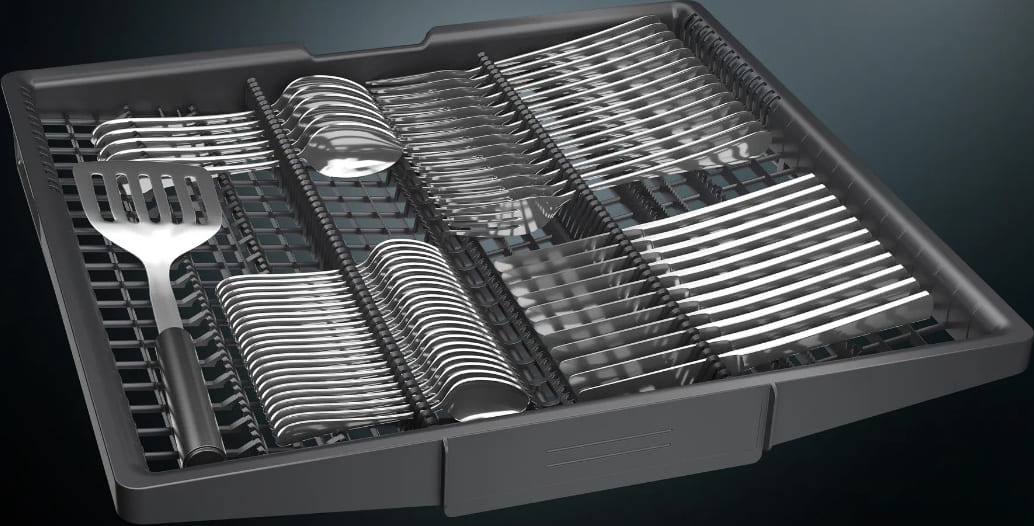 Встраиваемая модель Сименс отлично впишется в любой интерьер, главное — правильно выбрать место, чтобы подвести коммуникации. Устанавливается в нишу целиком, полностью закрывается декоративной панелью. Обратите внимание: в комплекте не идет фасад, его необходимо установить самостоятельно. Имеет стандартные размеры, поэтому может не поместиться на очень маленькой кухне. В камеру можно загрузить ограниченное число комплектов: 13 шт. Комплектом считается набор посуды на одного человека, который нужен для полноценного приема пищи: глубокая и плоская тарелки, тарелка для салата, блюдце под чашку, сама чашка, ложка и вилка.