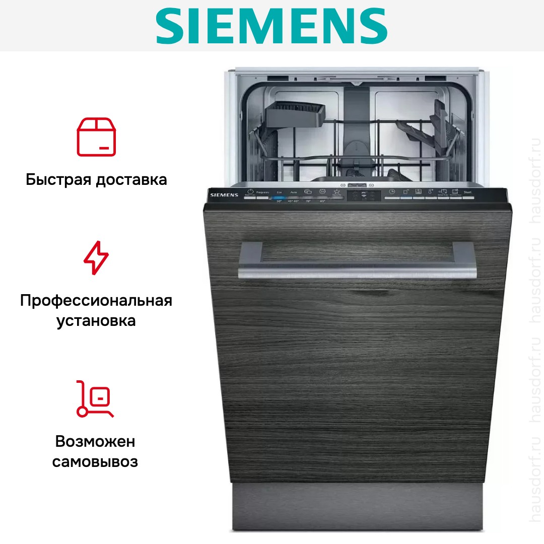 Встраиваемая модель Сименс отлично впишется в любой интерьер, главное — правильно выбрать место, чтобы подвести коммуникации. Устанавливается в нишу целиком, полностью закрывается декоративной панелью. Обратите внимание: в комплекте не идет фасад, его необходимо установить самостоятельно. Имеет уменьшенную ширину — благодаря этому поместится даже на очень маленькой кухне. В камеру можно загрузить ограниченное число комплектов: 9 шт. Комплектом считается набор посуды на одного человека, который нужен для полноценного приема пищи: глубокая и плоская тарелки, тарелка для салата, блюдце под чашку, сама чашка, ложка и вилка.