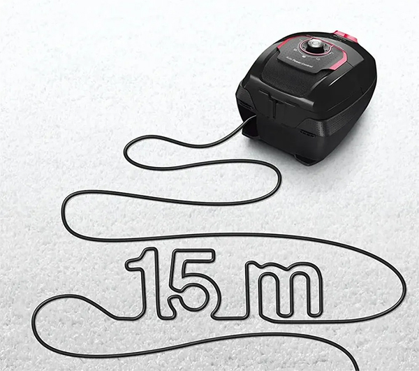 Шнур питания автоматически сматывается по завершении уборки. Для удлинения расстояния от корпуса до насадки используется специальная трубка, в данном случае — телескопическая.