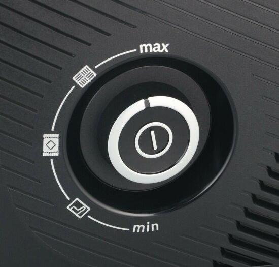 Управление мощностью на корпусе пылесоса производится при помощи поворотного переключателя или кнопок с обозначениями «+» и «-». Расположение управляющих элементов на корпусе — особенность напольных пылесосов: кнопки на них достаточно велики, чтобы нажимать их можно было не только рукой, но и ногой.