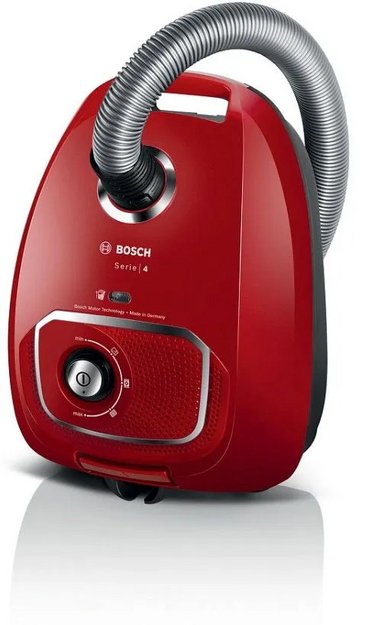 Пылесос Bosch BGLS4X380 имеет стандартную конфигурацию — корпус на колесах, крепящийся к нему шланг с трубками-удлинителями и насадками. Данная модель рассчитана только на сухую уборку, которой достаточно для большинства пользователей. Мощный поток воздуха позволяет быстро всасывать как мелкие, так и крупные частицы, волосы и шерсть. Основной цвет прибора — красный. Пылесборник-мешок — привычный вариант, с которым легко работать, можно не беспокоиться о чрезмерном расходе электроэнергии. Он тщательно запирает внутри крупную пыль, но может незначительно пропускает очень мелкие частицы. Объем заполнения пылесборника — 4 л.