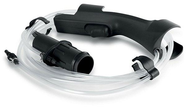 Шнур питания автоматически сматывается по завершении уборки. Для удлинения расстояния от корпуса до насадки используется специальная трубка, в данном случае — телескопическая.
