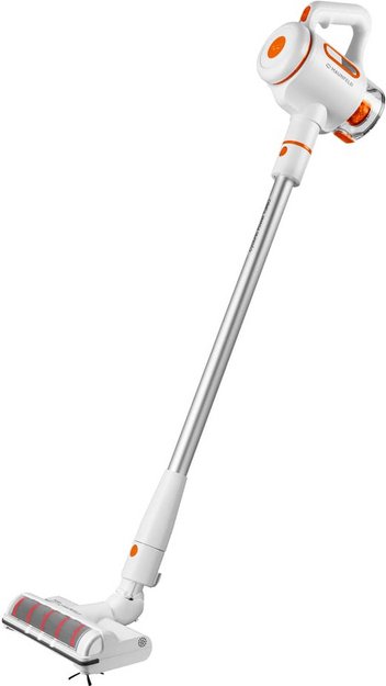 Прибор питается от аккумулятора, поэтому вам придется потратить время на его зарядку, зато в процессе уборки провод сети и удаленность от розетки никак не будут мешать. Чтобы мотор не перегревался, модель оснащена специальной защитой, которая предотвращает неполадки. Предусмотрена удобная система парковки — вертикальная, с которой пылесос занимает меньше места.