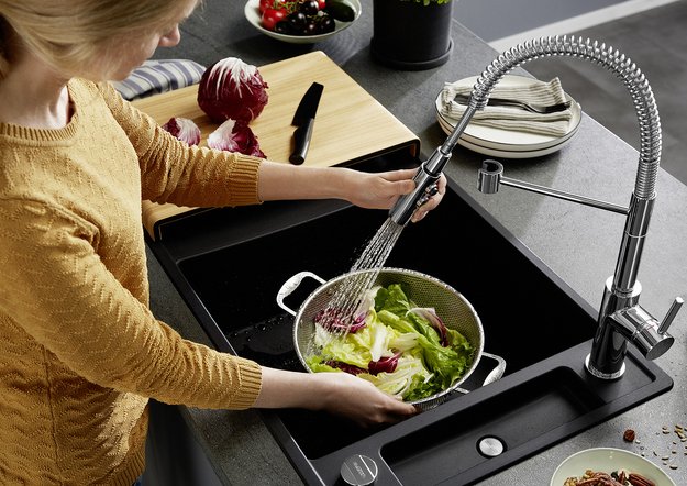 Специальная насадка позволяет выдвинуть излив как маленький шланг и направить струю в слишком высокую кастрюлю, которая не помещается под стационарным краном, на овощи в раковине, на загрязнения в неудобных уголках мойки, которые нужно удалить и т.д. Благодаря особой конструкции вы можете также направить воду из раковины в ванну или из одной чаши мойки в другую одним поворотом крана в нужную сторону.