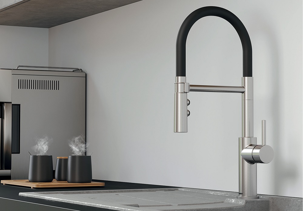 Внутри крана помещается шланг, который можно растянуть, чтобы достать струей воды до второй чаши мойки или тщательно сполоснуть посуду.