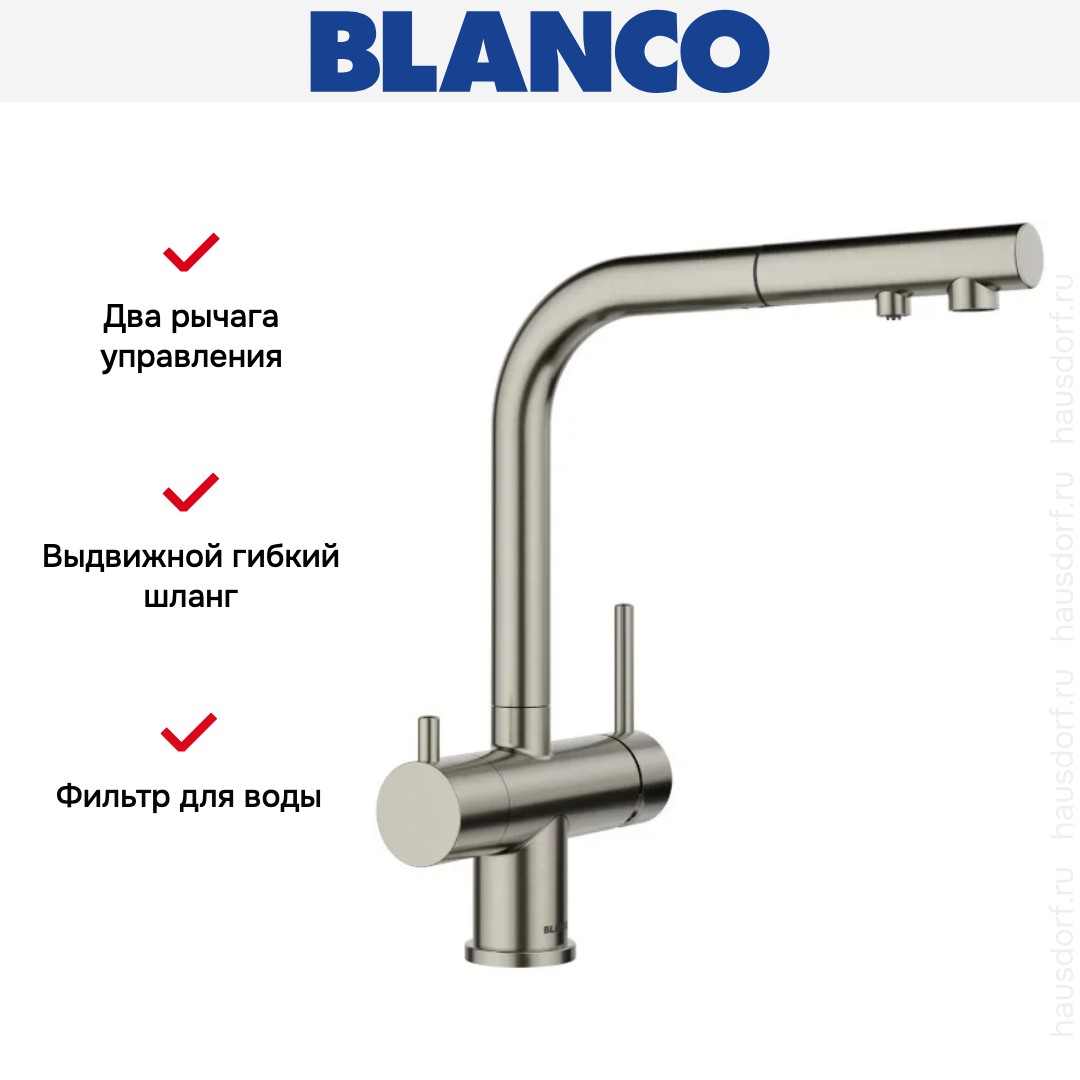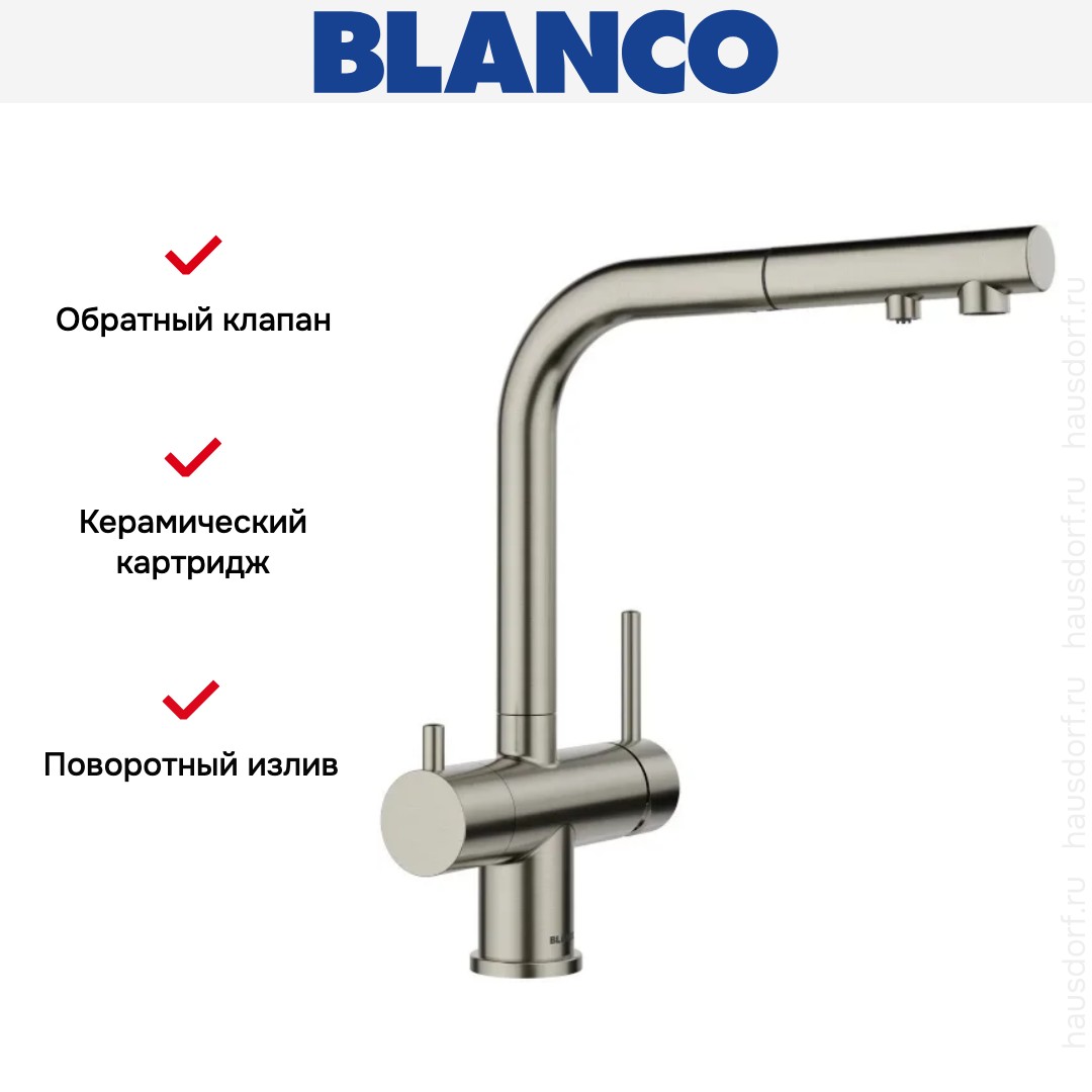 Смеситель Бланко — отличный выбор для кухни и ванной комнаты. Классический вариант с двумя вентилями подойдет большинству пользователей: нужно настраивать напор и температуру воды из «горячей» и «холодной трубы» отдельно, поток смешивается внутри крана и на выходе имеет оптимальную температуру. Благодаря запорному механизму в виде керамических пластин такой смеситель прослужит много лет, так как в нем отсутствуют быстро стирающиеся прокладки; также на клапане практически не образуется накипь. При повороте ручки диски внутри смещаются относительно друг друга — открывают или блокируют воду.
