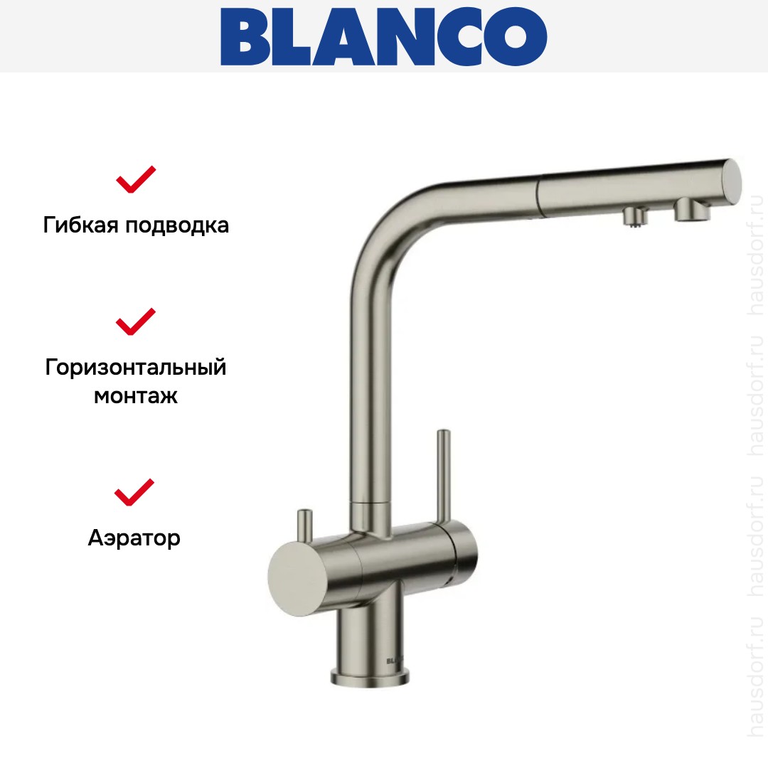 Модель Blanco FONTAS-S II 527715 устанавливается привычным способом: на бортик мойки или ванной в предназначенные для этого отверстия (они могут быть вырезаны производителями заранее, но если нет, при достаточной ширине можно добавить их самостоятельно). Гибкая подводка позволяет расположить сантехнику в любом удобном месте, при этом нужно учитывать несколько важных нюансов: для максимальной надежности лучше выбирать сильфонные рукава, нельзя использовать ее вместо стационарного водопровода, только как соединительный элемент для крана. Благодаря специальному клапану смеситель не пропускает воду в обратном направлении — это защищает от проблем с водоснабжением как вас, так и ваших соседей.