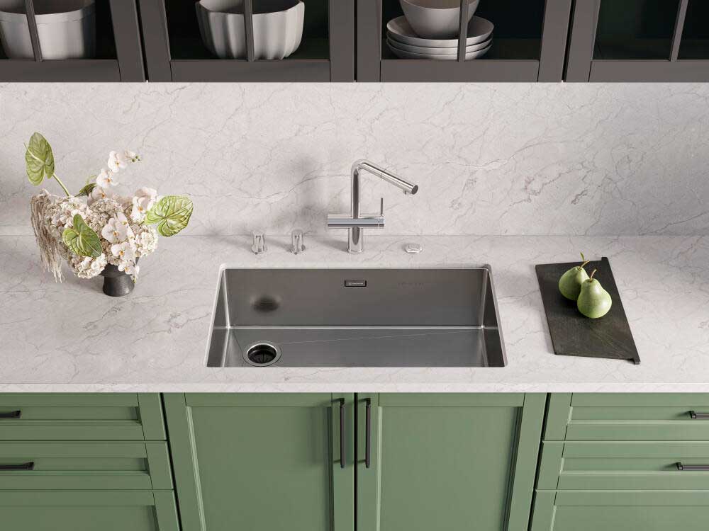 Специальная насадка позволяет выдвинуть излив как маленький шланг и направить струю в слишком высокую кастрюлю, которая не помещается под стационарным краном, на овощи в раковине, на загрязнения в неудобных уголках мойки, которые нужно удалить и т.д. Дополнительная деталь, которая повышает комфорт использования, — аэратор. Он делает поток воды мягче, насыщая его кислородом, таким образом дополнительно уменьшая ее расход: объем струи увеличивается за счет воздуха, а не за счет повышения напора из водопровода. К этой модели можно подключить фильтр для питьевой воды.