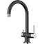 Рычаг для включения фильтрованной воды применяется в современных комбинированных смесителях, где из одного и того же излива подается и водопроводная, и питьевая вода. Такие смесители типа «два в одном» отличаются от обычных тем, что имеют не два подключения, а три, где третье соединяет смеситель с фильтром. Очищенная вода подается по изолированной трубке, проходящей внутри излива. Для удаления накипи, солей металлов, микроорганизмов и прочих вредных примесей могут применяться различные типы фильтров. Проточные фильтры устанавливаются под мойкой и включают несколько картриджей, которые необходимо менять по мере использования. С их помощью можно избавиться от таких примесей, как железо, хлор и многие другие. Устройства с системой обратного осмоса оснащаются диффузором, включающим картриджи для предварительной очистки и осмотическую мембрану, задерживающую практически все вредные примеси.