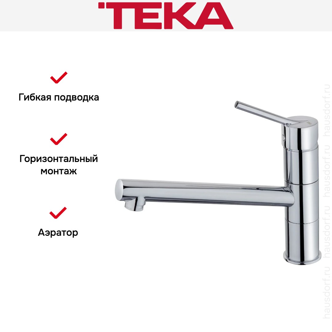 Смеситель Teka INN-913 Chrome. Элегантный хромированный корпус и лаконичная форма делают изделие заметным, но ненавязчивым элементом интерьера кухни. Низкий, аккуратный излив высотой 13 см и длиной 24,6 см формирует компактный профиль, который гармонично вписывается в компактные моечные зоны и островные решения. Гладкая зеркальная поверхность легко чистится и сохраняет презентабельный вид долгое время при правильном уходе.