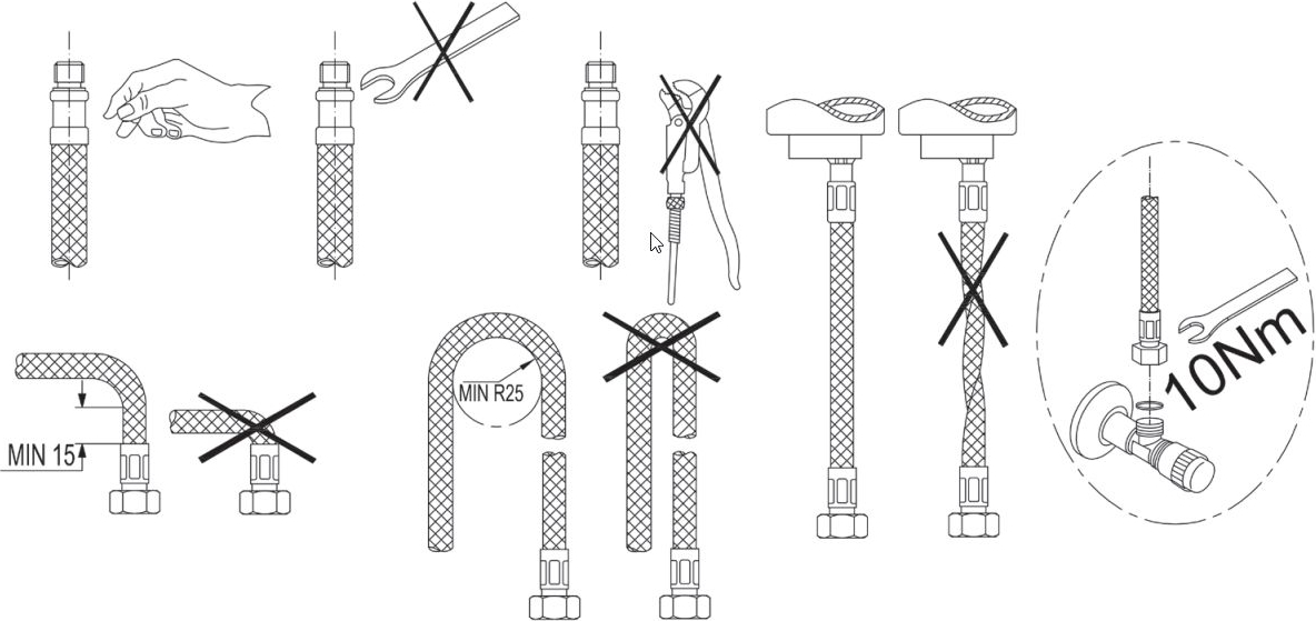 Модель Teka MTP 915 устанавливается привычным способом: на бортик мойки или ванной в предназначенные для этого отверстия (они могут быть вырезаны производителями заранее, но если нет, при достаточной ширине можно добавить их самостоятельно). Гибкая подводка позволяет расположить сантехнику в любом удобном месте, при этом нужно учитывать несколько важных нюансов: для максимальной надежности лучше выбирать сильфонные рукава, нельзя использовать ее вместо стационарного водопровода, только как соединительный элемент для крана.