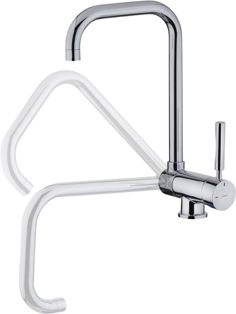 Высота излива — один из важнейших параметров, которые необходимо учитывать при выборе кухонного смесителя. Высотой называется расстояние от поверхности, на которой установлен смеситель, до его носика, то есть это, по сути, длина струи воды. Подбирать модель по высоте следует так, чтобы в раковину без труда помещались любые емкости, которыми вы пользуетесь, включая большие кастрюли и высокие вазы, а вода при ударе о дно раковины не разбрызгивалась во все стороны. Чем больше высота излива, тем глубже должна быть раковина.