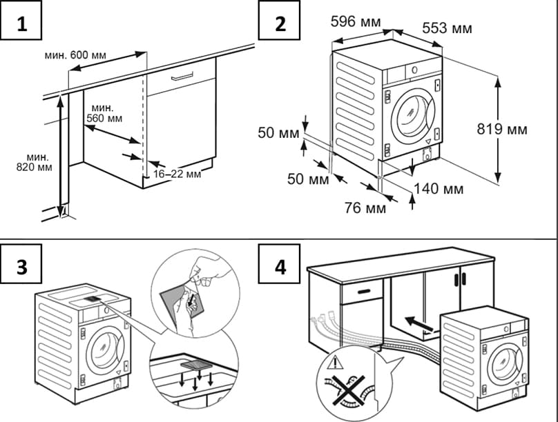 Машина размещается в нише, образованной столешницей и стенками рядом стоящей мебели так, чтобы сбоку оставался зазор не менее 1 см с каждой стороны. Сзади также должно оставаться свободное пространство для легкого доступа к шлангам.