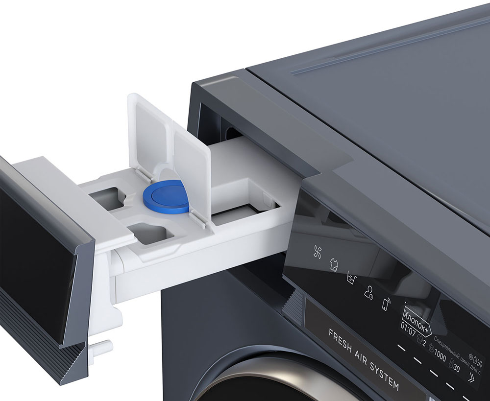 Цвет этой стиральной машинки — серый. Ее можно установить в колонну с сушильной машиной, чтобы оптимизировать рабочее пространство и сделать удобный «прачечный» уголок. Обычно для этого необходимы специальные соединительные элементы — ищите их в разделе «Аксессуары».