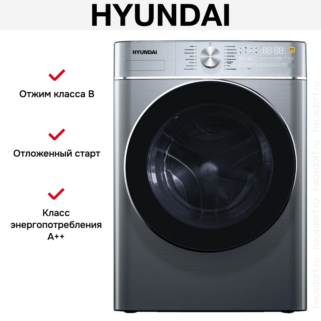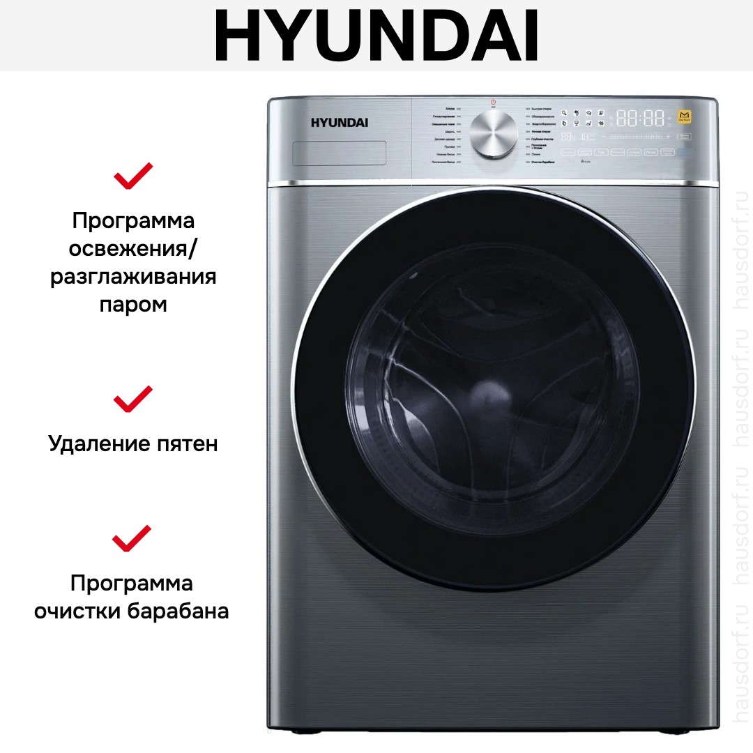 Стиральная машина Hyundai WME9413 представлена в современном темно-серебристом цвете с чёрным люком, что делает её элегантным дополнением интерьера. Корпус аккуратных габаритов 85×60×57 см рассчитан на стандартное размещение в кухонной нише или отдельном помещении. Угол открытия дверцы 135° и диаметр люка 33 см упрощают загрузку и выгрузку даже громоздких вещей.