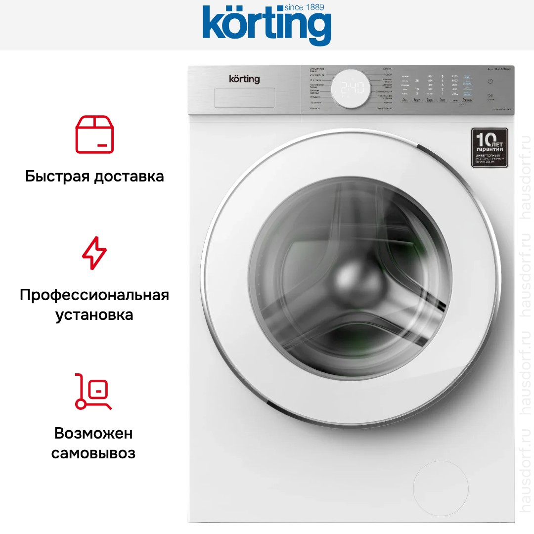 Стиральная машина Korting KWM 60DM1201 — мощный и практичный прибор для дома с фронтальной загрузкой и вместимостью до 10 кг белья. Модель выполнена в универсальном белом цвете, снабжена белым люком и впишется в любой интерьер благодаря строгим формам и нейтральной цветовой гамме. Габариты 85×59.5×62 см делают устройство подходящим для стандартных ниш и кухонных зон. При открытой дверце глубина составляет 113.9 см, угол открытия — 130°, что упрощает погрузку объемных вещей. Барабан из нержавеющей стали гарантирует бережное отношение к ткани и долговечность.
