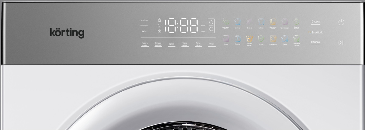 Эта модель — комбинация стирки и сушки, что полезно людям, которые не могут или не хотят приобретать отдельно сушильную машину, при этом в квартире нет балкона или лоджии, чтобы с комфортом сушить одежду на веревках. Вы можете отложить запуск, если хотите сэкономить на тарифах и включить машинку ночью, либо если планируете развесить белье сразу после возвращения работы и не ждать, пока закончится цикл. На панели управления отображаются разнообразные индикаторы, чтобы было проще следить за процессом, например: времени до окончания стирки, выбора дополнительных функций, блокировки дверцы, блокировки от детей, выбранной программы. Скорость отжима достигает 1200 оборотов в минуту.