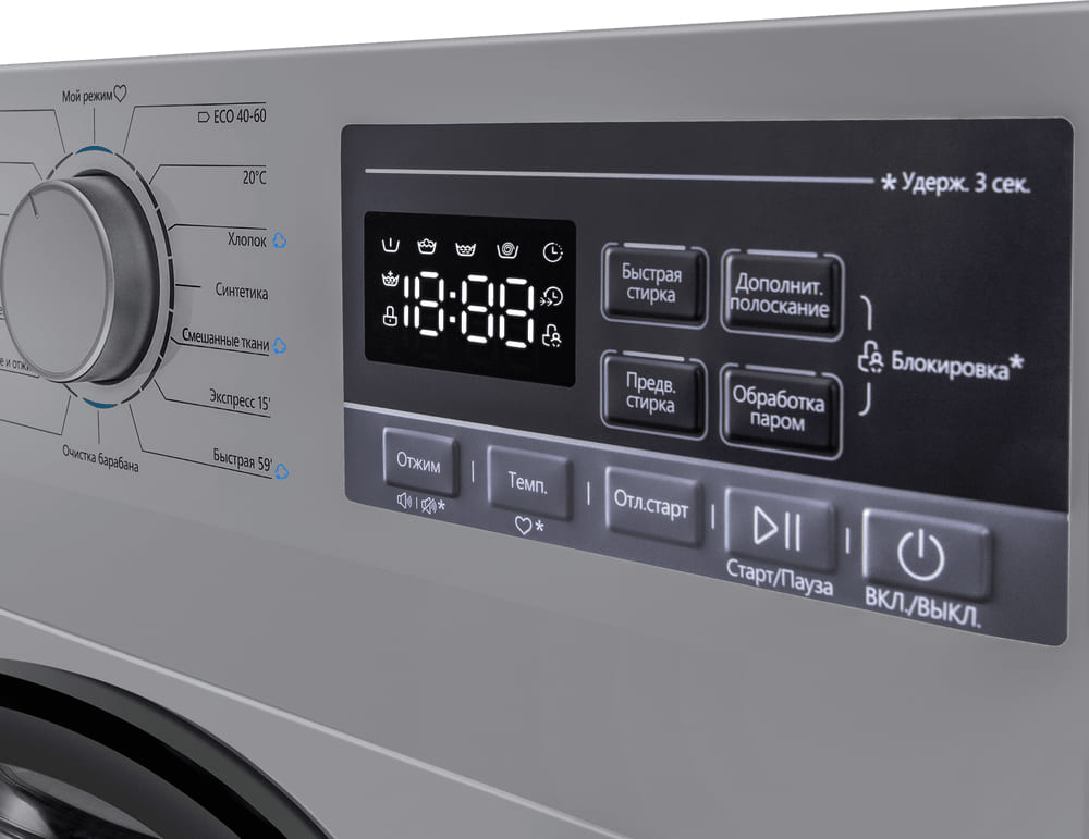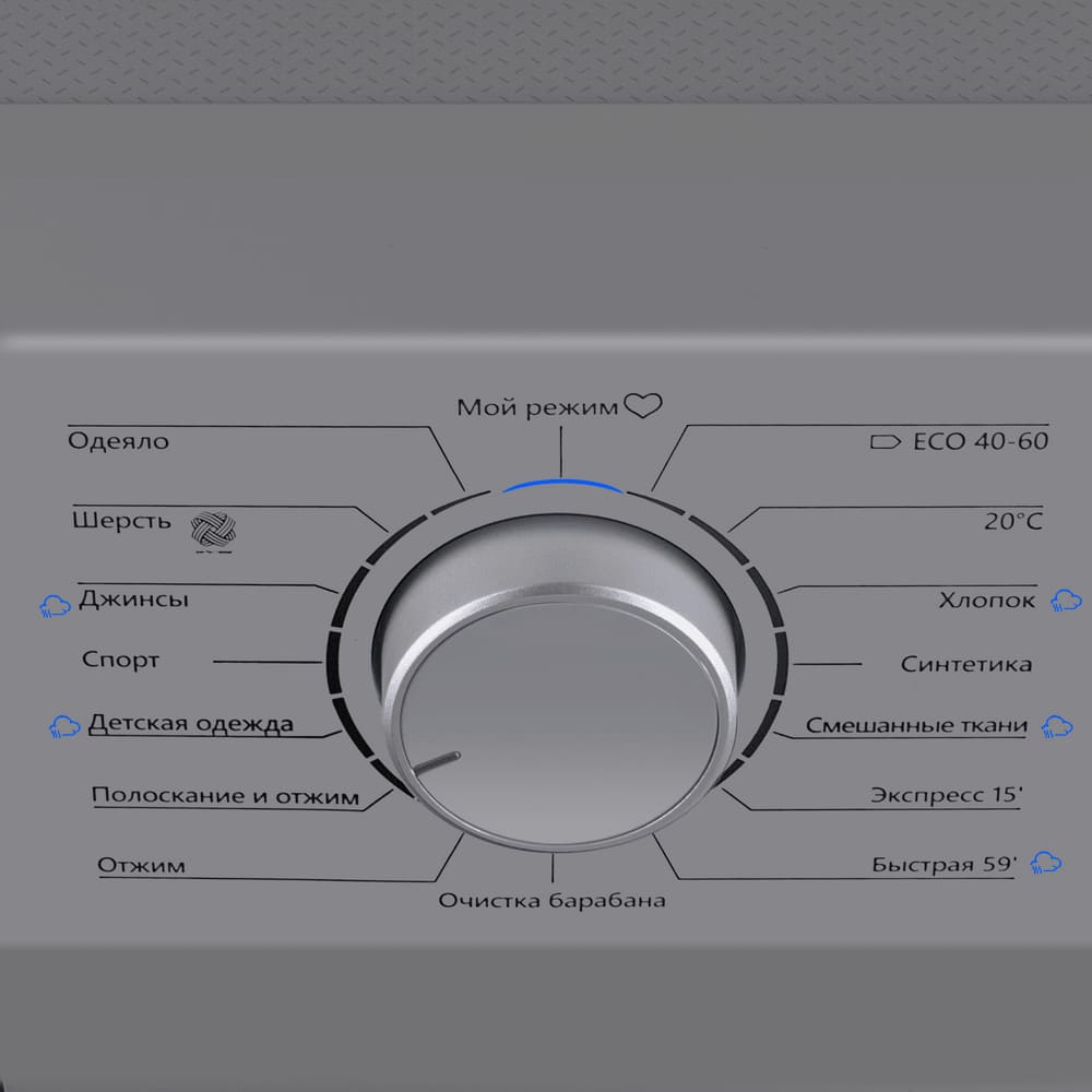Электронное управление удобно и понятно. Для выбора программ используются кнопки, поворотный программатор. Количество режимов для стирки разных типов белья: 16.