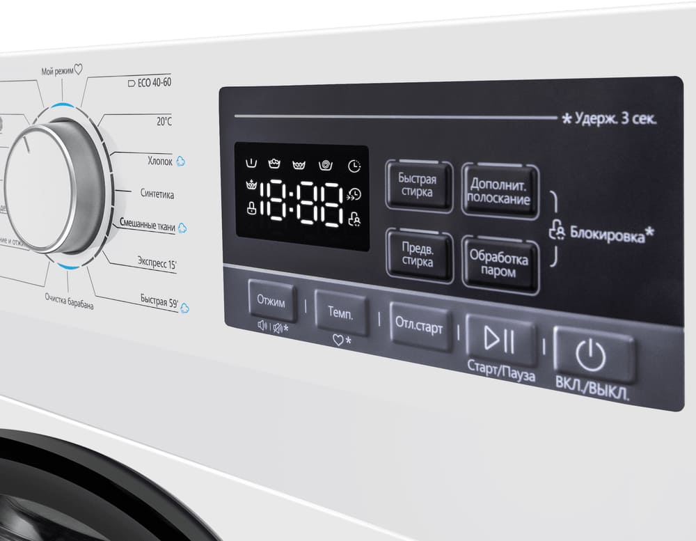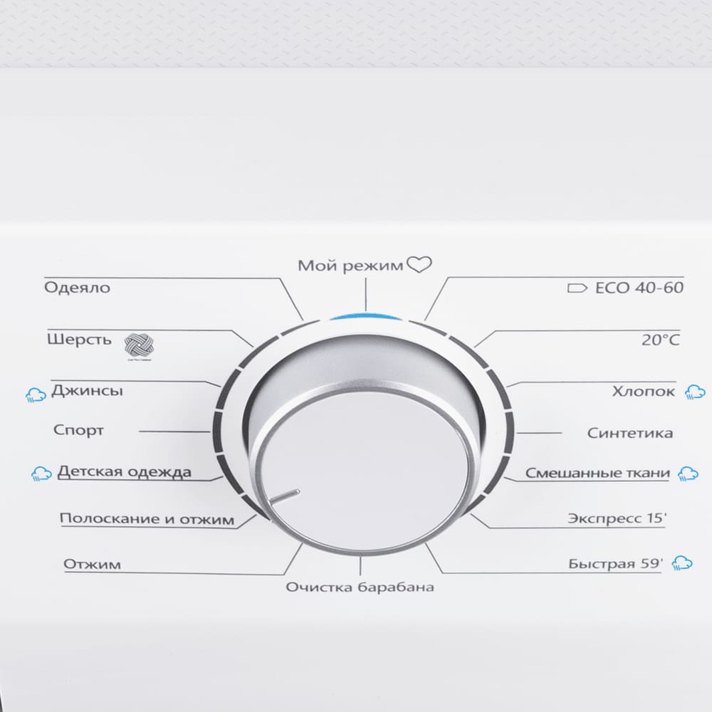 Электронное управление удобно и понятно. Для выбора программ используются кнопки, поворотный программатор. Количество режимов для стирки разных типов белья: 16.