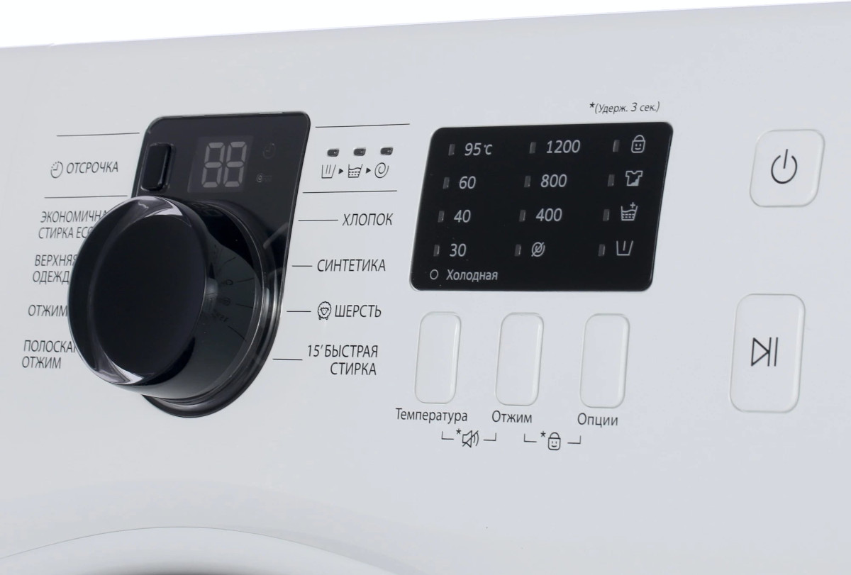 Вы можете отложить запуск, если хотите сэкономить на тарифах и включить машинку ночью, либо если планируете развесить белье сразу после возвращения работы и не ждать, пока закончится цикл. На панели управления отображаются разнообразные индикаторы, чтобы было проще следить за процессом, например: хода программы, температуры стирки, скорости отжима, времени до окончания стирки, выбора дополнительных функций, блокировки дверцы, блокировки от детей, выбранной программы. Скорость отжима достигает 1200 оборотов в минуту. Функцию отжима можно будет отключить вручную, если она вам не нужна.