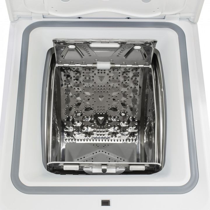 Модели с вертикальной загрузкой отличает надежное крепление барабана на двух валах. Еще одно их отличие — особая конструкция люка: на нем имеется отверстие, закрывающееся на замок. Чтобы получить доступ к барабану, необходимо открыт его и отодвинуть створку.